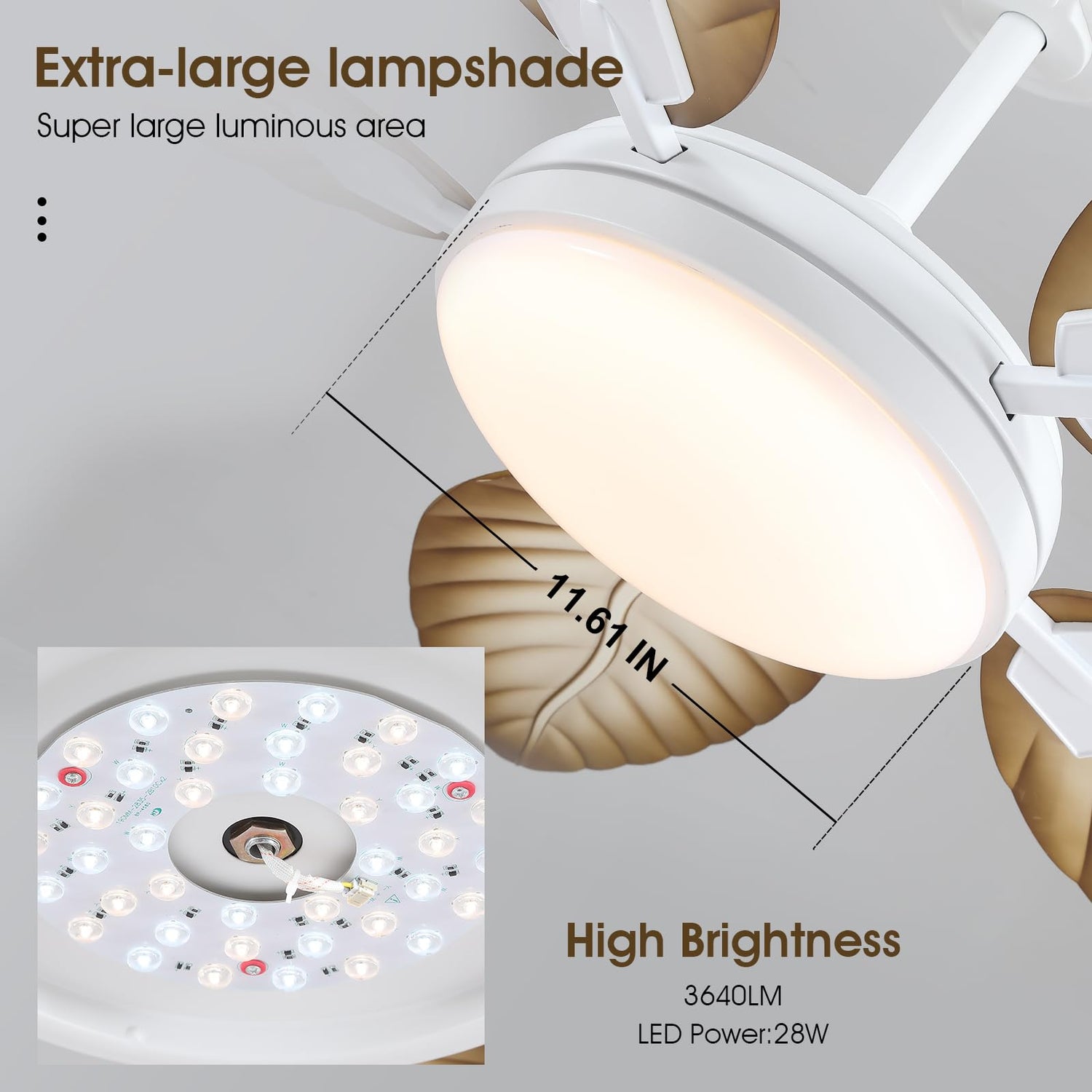 • [Bright LED with super large luminous area] : Modern ceiling fan with super bright lumen adopts full spectrum LED light source, infinitely close to natural light , extra-large lampshade has a super larger luminous surface area than other ceiling fans on the market,Low blue light with no flash is eye-friendly, it supports 3 colors temperatures,stepless dimming and memory function, you can adjust the brightness from dim to bright with 3 light colors : white, warm and neutral light. Choose your favorite color, and all settings will be remembered