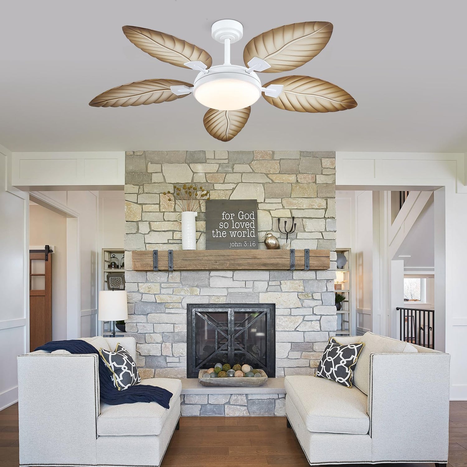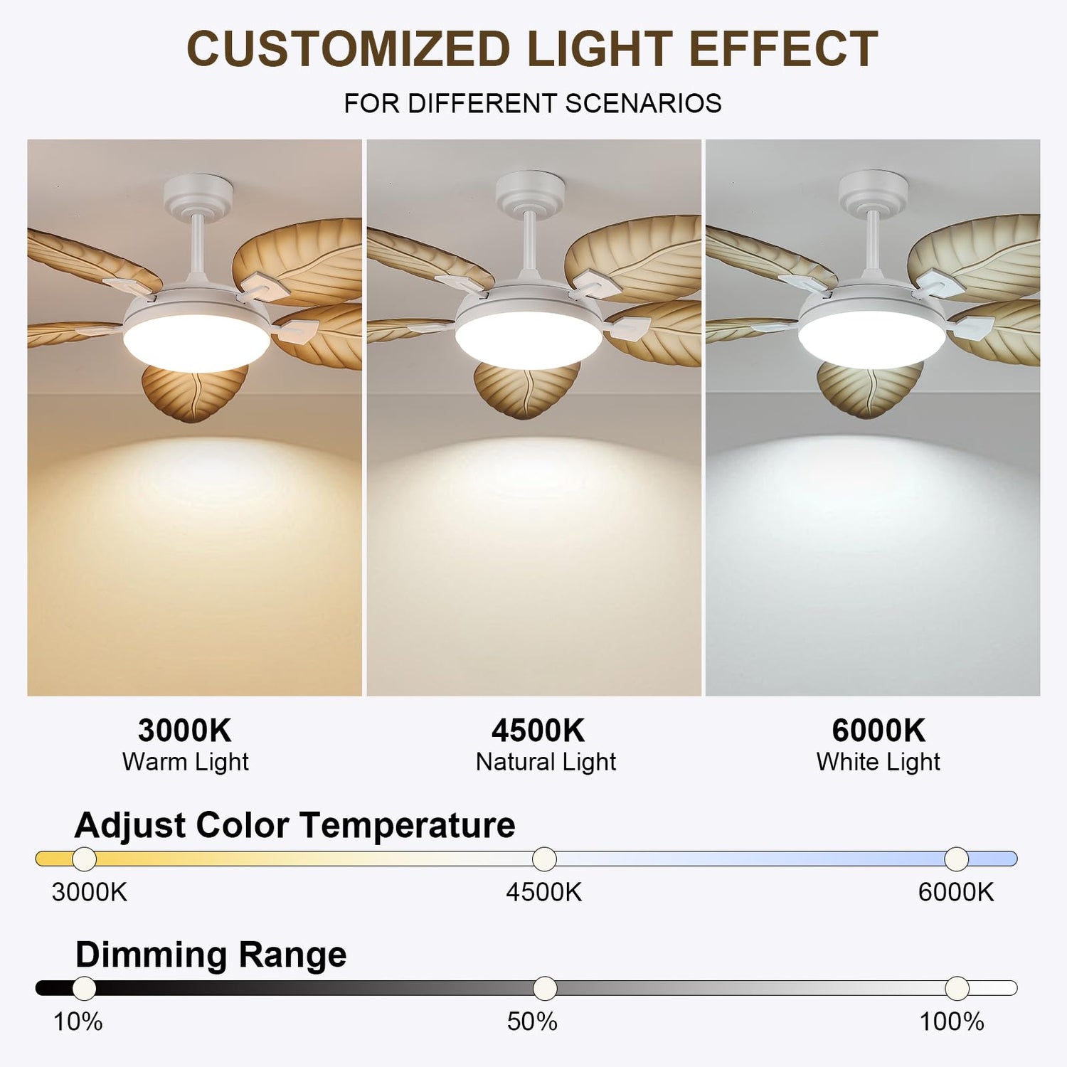 • [Beautiful Tropical Ceiling Fan]: 52"outdoor ceiling fan features 5 unique palm leaf blades with exquisite craft, attractive appearance can add natural beauty and elegance to any space.the design of angled blades and 50W powerful DC Motor can easily generate powerful airflow without shaking at very low noise level, it's a real perfect combination of beauty and practicability. Ideal for sleeping,reading, working and home decoration
