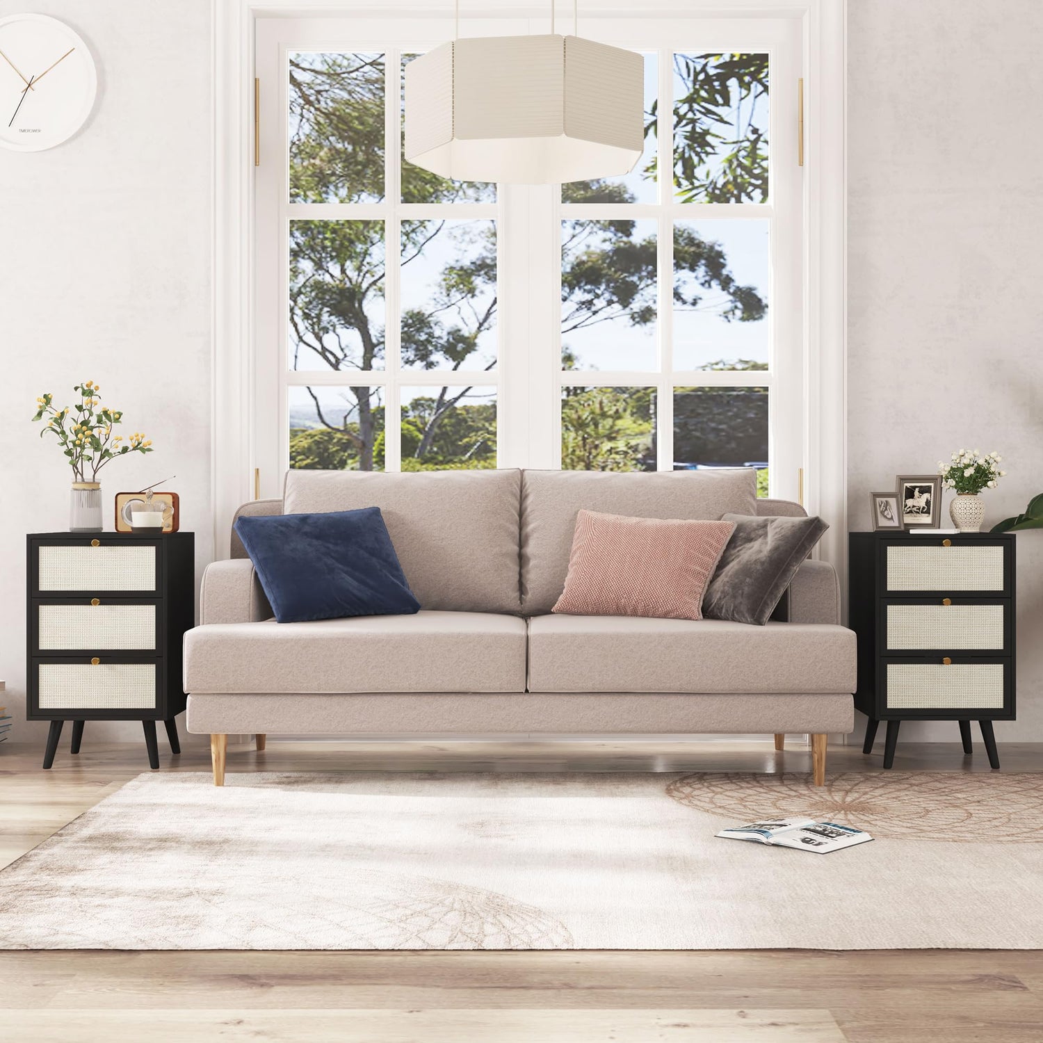 PHOYAL Rattan Nightstand Set of 2, End Table Rattan Bedside Table with Storage 3-Drawer Side Table with 3 Hand Made Rattan Decorated Drawers Wood Accent Table, Black 2 Pack