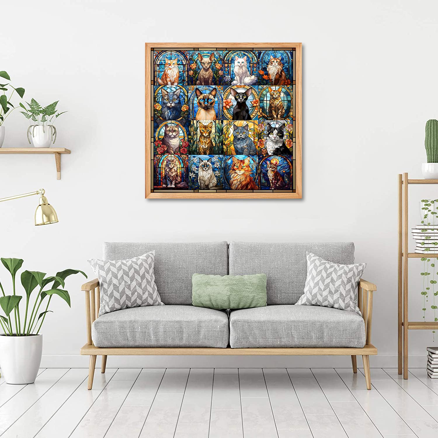 - Stained Glass Cat Jigsaw Puzzle 1000 Pieces: Dive into a colorful challenge with 16 uniquely designed stained glass cats. Each cat showcases vibrant hues, combining to create a captivating display of art and feline elegance