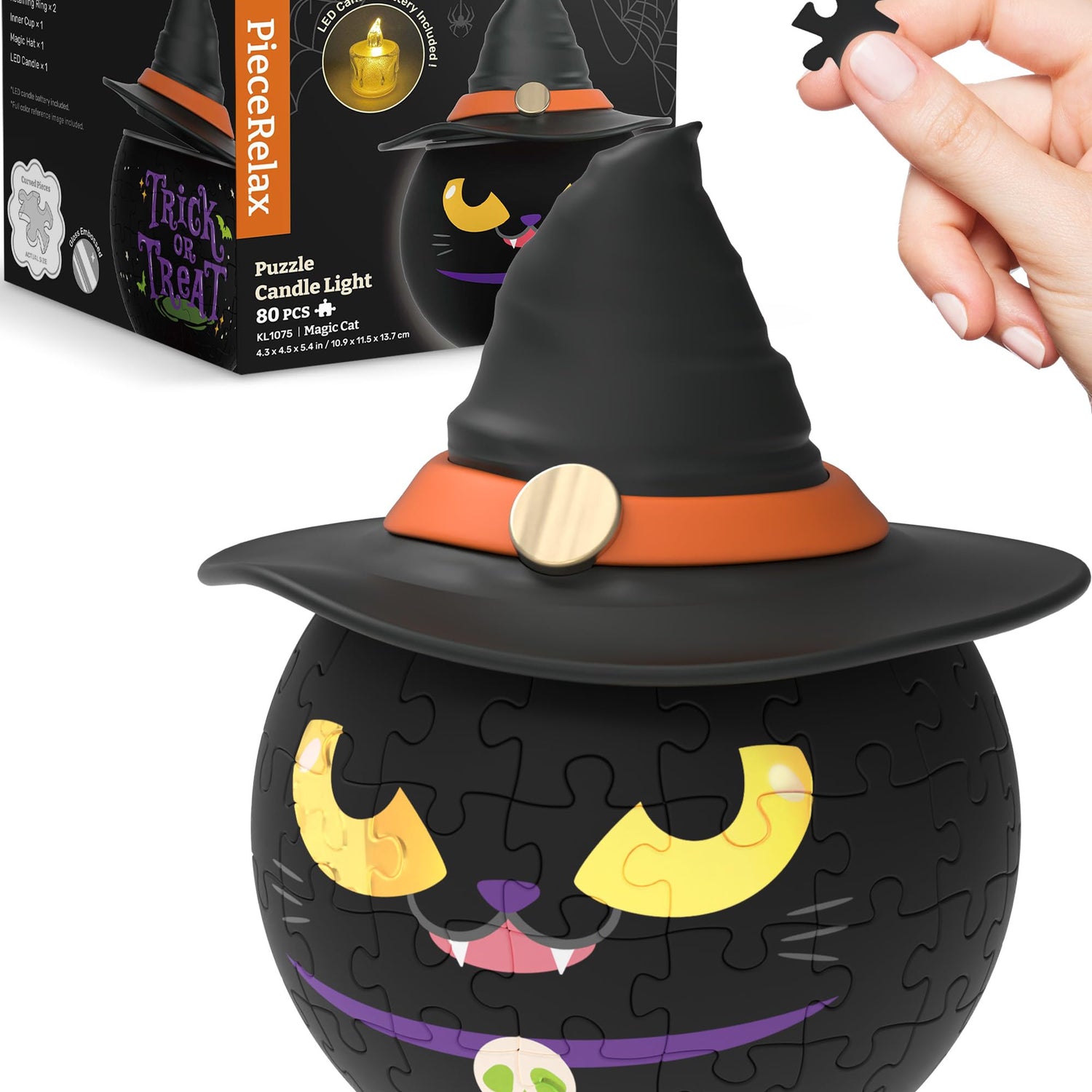 PieceRelax 3D Halloween Puzzle Candle Light - LED Jack O’ Lantern Decor with Flameless Tea Lights - Battery Operated Plastic Pumpkins for Indoor & Outdoor Spooky Decorations, Magic Cat [KL1075]