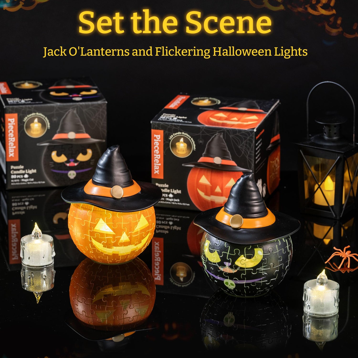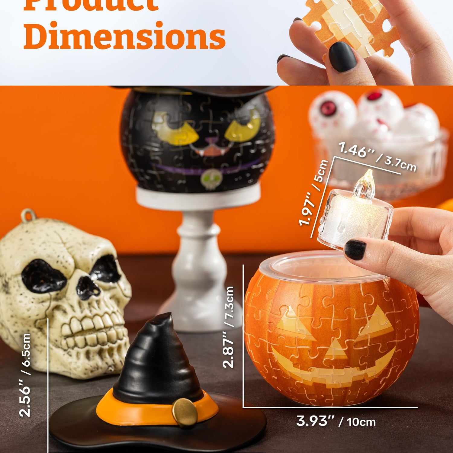 - PUZZLINGLY PERFECT - Add a playful twist to your Halloween decor! The Halloween Puzzle Candle Light is a fun 3D puzzle and captivating centerpiece. Engage guests with battery-operated, flameless tea lights inside plastic pumpkins. This faux jack-o-lantern captures Halloween’s spirit with its charming, flickering light.