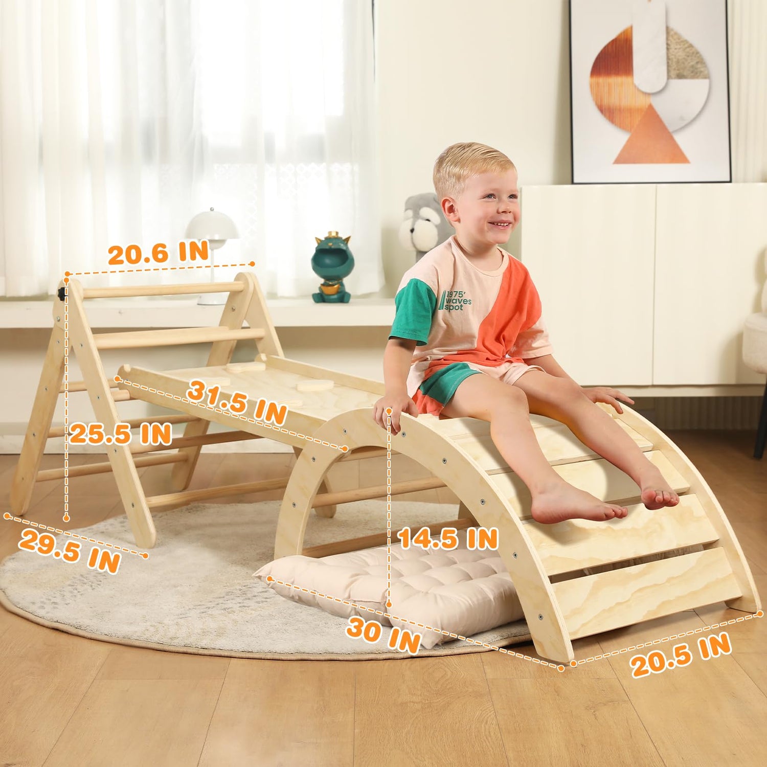 - DEVELOPS SKILLS: This multifunctional wooden triangle set attracts boys to use their imagination to find a variety of ways to play and improve little boys' exploration ability, balance, and physical coordination as a result of outdoor sports can train children's physical fitness so that the little girl can enjoy the fun of climbing. Physical activity helps develop balance, strength, and coordination. Perfect for Montessori-inspired play, fostering independent exploration and growth