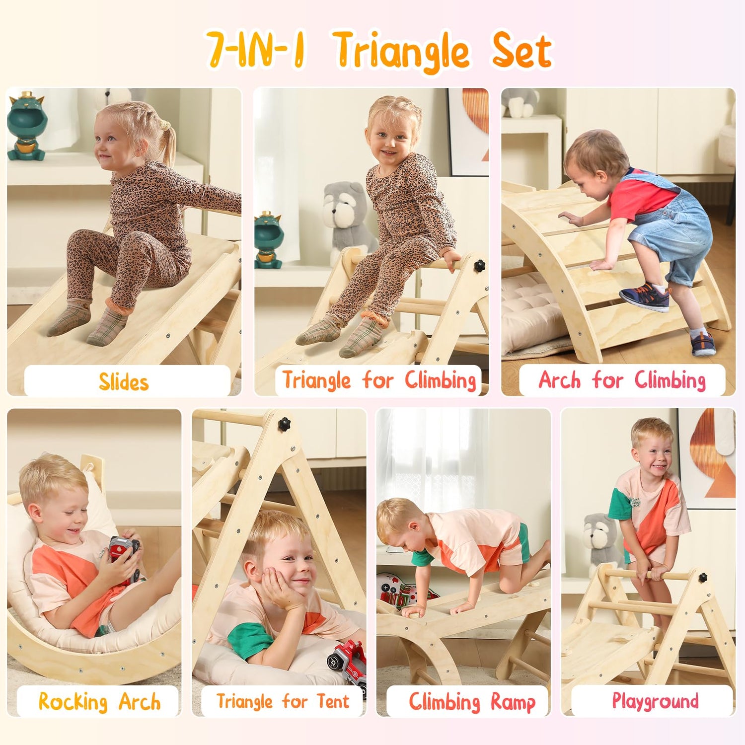 Pikler Triangle Set with Cushion, 7 in 1 Toddler Climbing Toys Indoor, Montessori Foldable Climbing Set, Wooden Climbing Toys for Toddlers 1-3 Inside with Ramp, Arch and Ladder (Nature Wood)