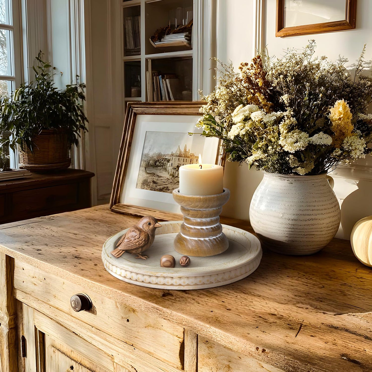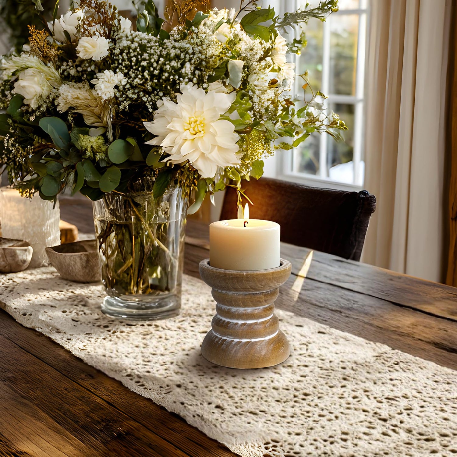 - [RUSTIC CANDLE STICK STANDS] The farmhouse candle holder features a vintage unique and exquisite curved design, And the rich white finish design and old-world textures blend for a refined classic elegant taste. Place your favorite pillar candle on the candle holder wood and the classic rustic wooden candle holder will become an elegant table decoration.