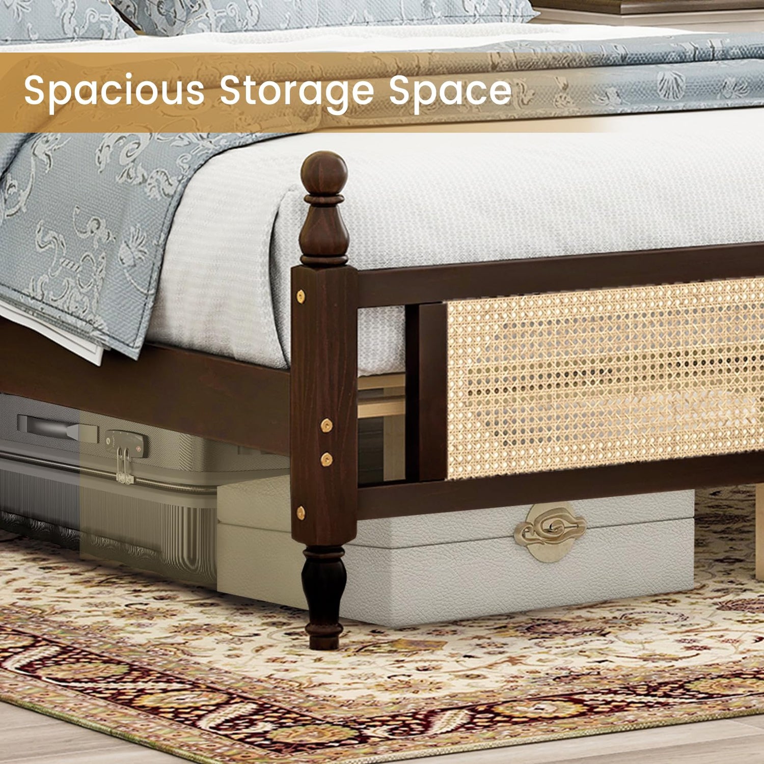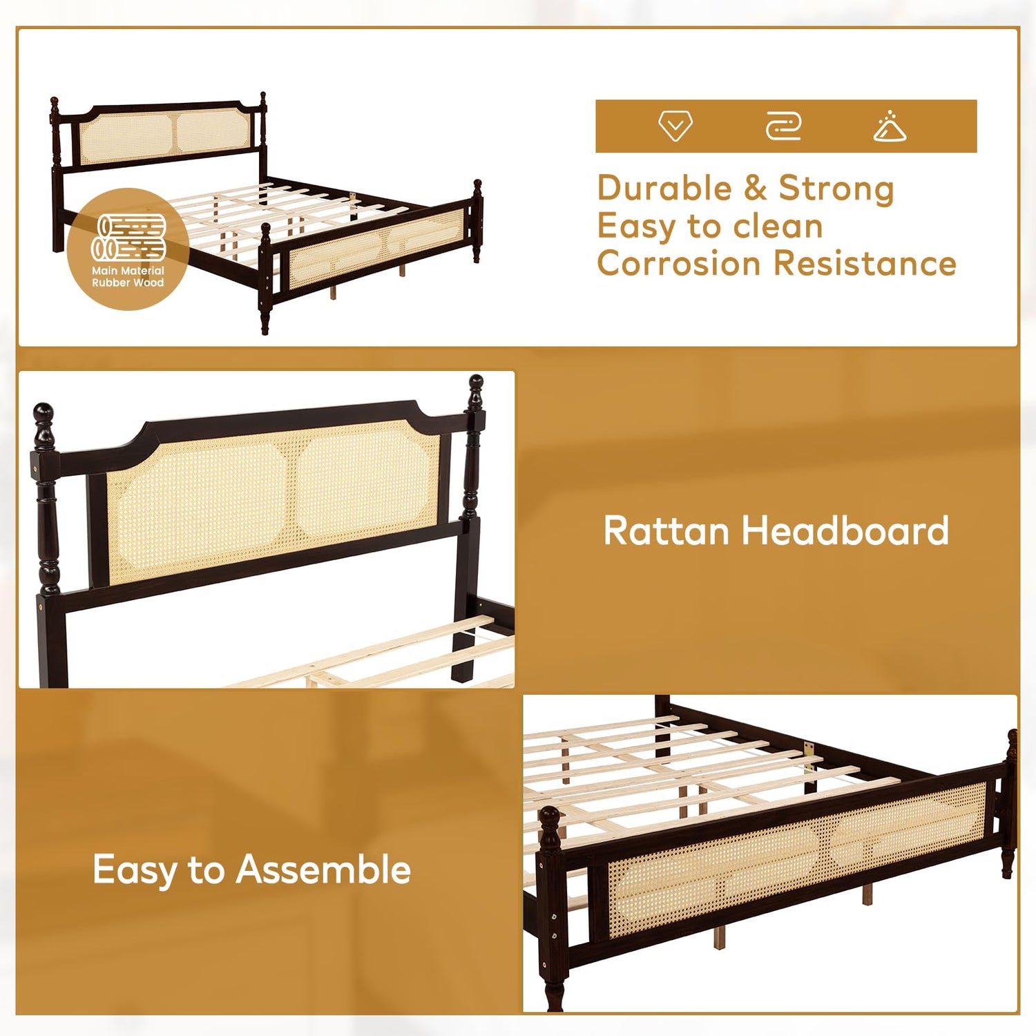 Pine Wood Bed Frame with Rattan Headboard, King Size - Modern Farmhouse Platform Bed, Sturdy Wooden Slat Support, No Box Spring Needed, Easy Assembly, Espresso