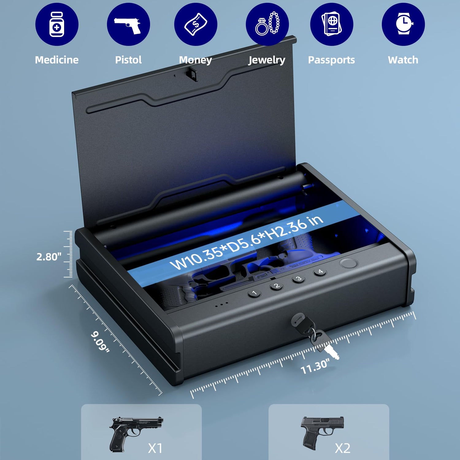PINEWORLD Gun Safe,Biometric Gun Safe For Handgun, Pistol Safe With Fingerprint Backlit Keypad, Quick Access Handgun Safe for Firearm, Gun Lock Box With Interior Light For Nightstand Car Normal Size
