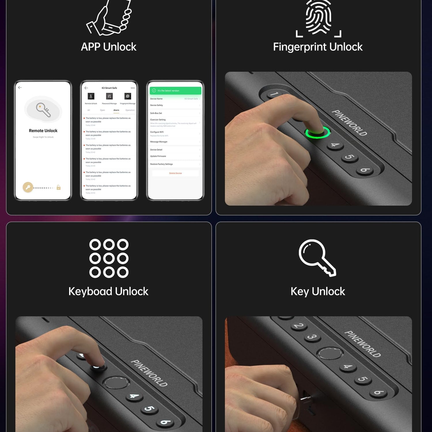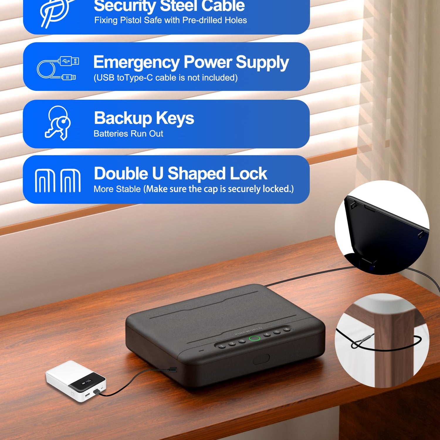 - Full Voice Prompt & Double U Design: Easy to use with full voice guide, you can follow the voice prompt to use your PINEWORLD gun safe anytime and anywhere. Double U Design is better for anti-theft function, but you need to make sure the cap is completely locked.