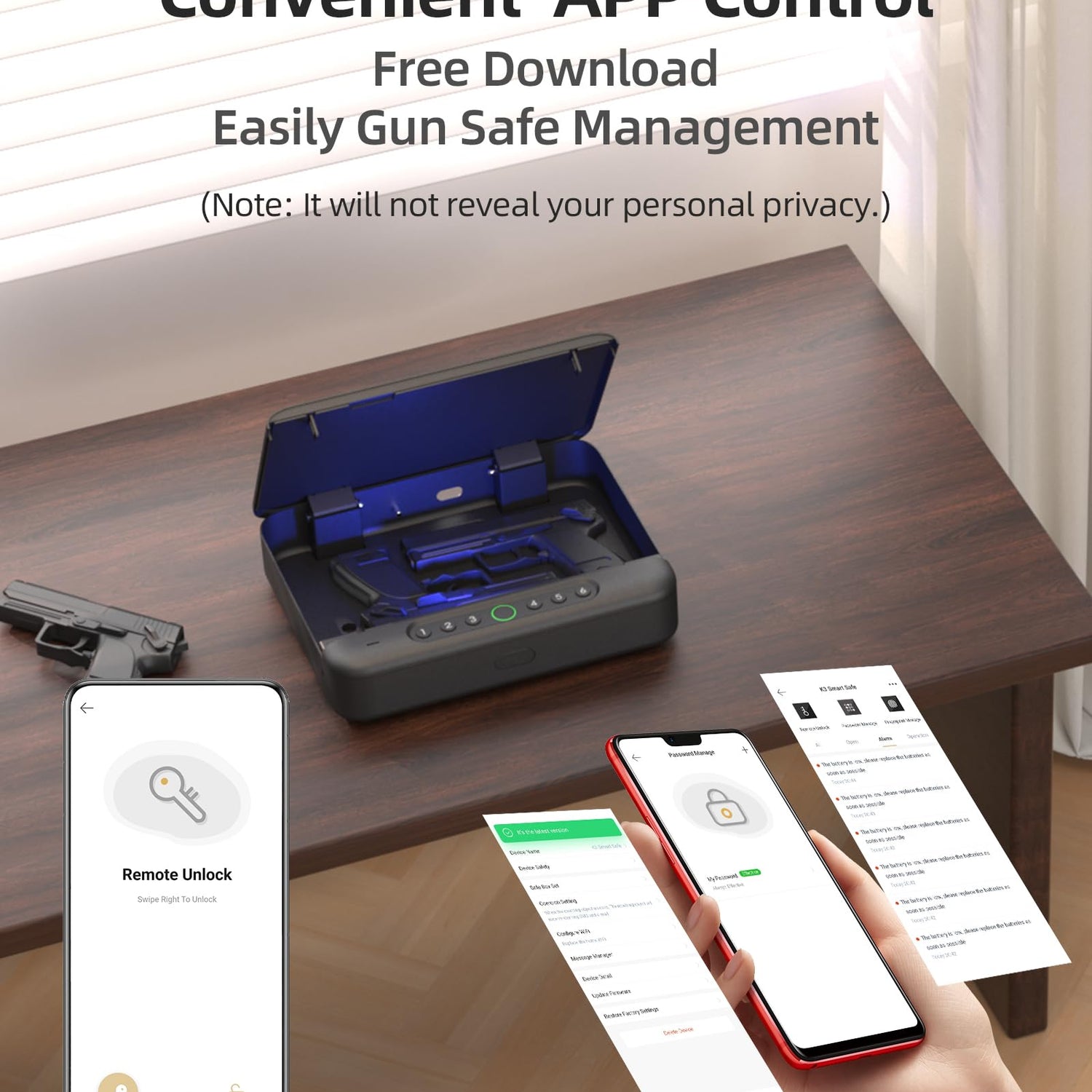 - Remote Control the Smart Safe-APP: You can remote control via APP-'FC SMARTHOME' . No matter unlock the pistol cases or notify of unauthorized access. In addition, you could add a new fingerprint or change your password in the APP.