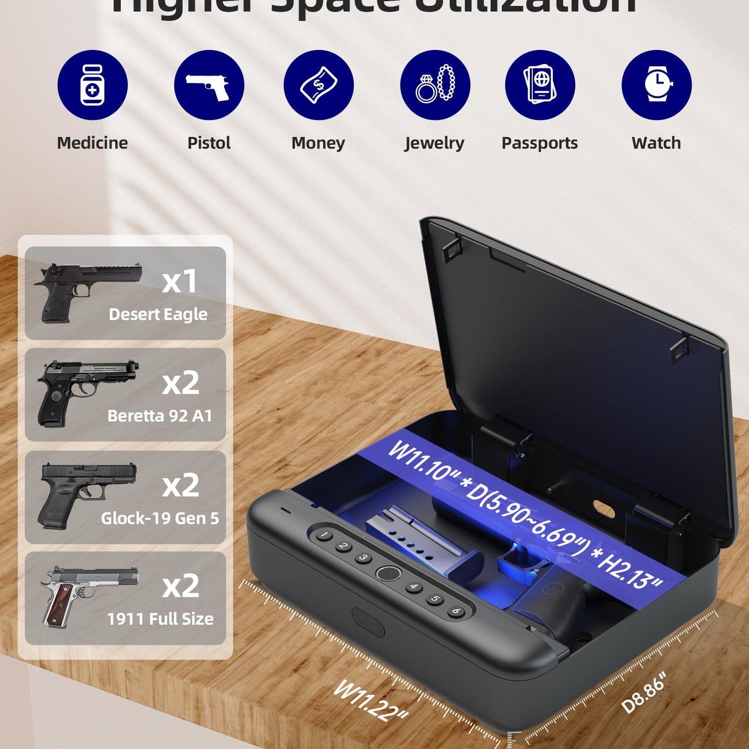 - 4 Quick Access Biometric Gun Safe: It can be quickly accessed via Fingerprint/Passcode/Key/APP. It is ideal for pistols, cash, and other valuables. Full digital keypad from 1-6, you can set 4 or 6 digit passcode as you like. Noted: The passcode can't be to simple like "1234", etc.