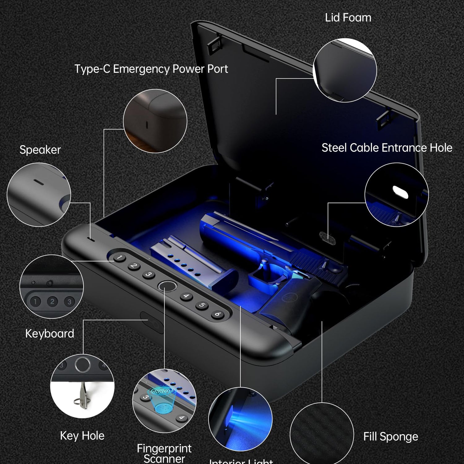 - Emergency Charging Port: Gun safe charging TYPE-C cable can be used in emergencies. Reminder: Do not keep long-term charging, it will affect the service life of the safe. (USB-A to TYPE-C Cable is not included).