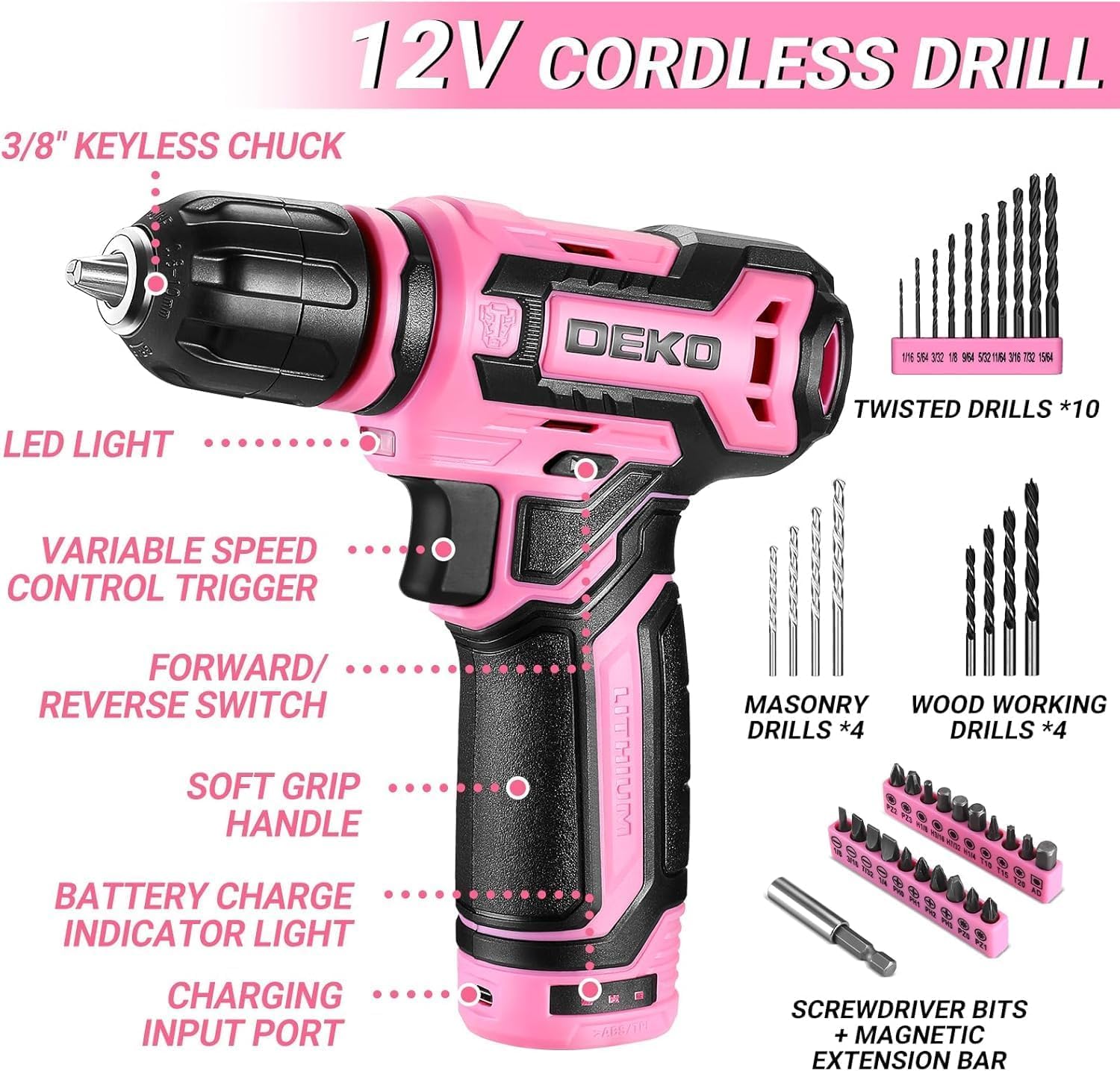 - 【CORDLESS DRILL】This 12Volt pink power drill has a 1.5Ah rechargeable Lithium-ion battery, quickly fully charged only 1.5 hours and can last for 1-3 hours. It can be last for 5-6 hours for normal household work - DIY or furniture installation etc. The maximum no-load speed of the electric drill is 800r/min. This pink drill tool set has toolbox that includes the type-C charger.