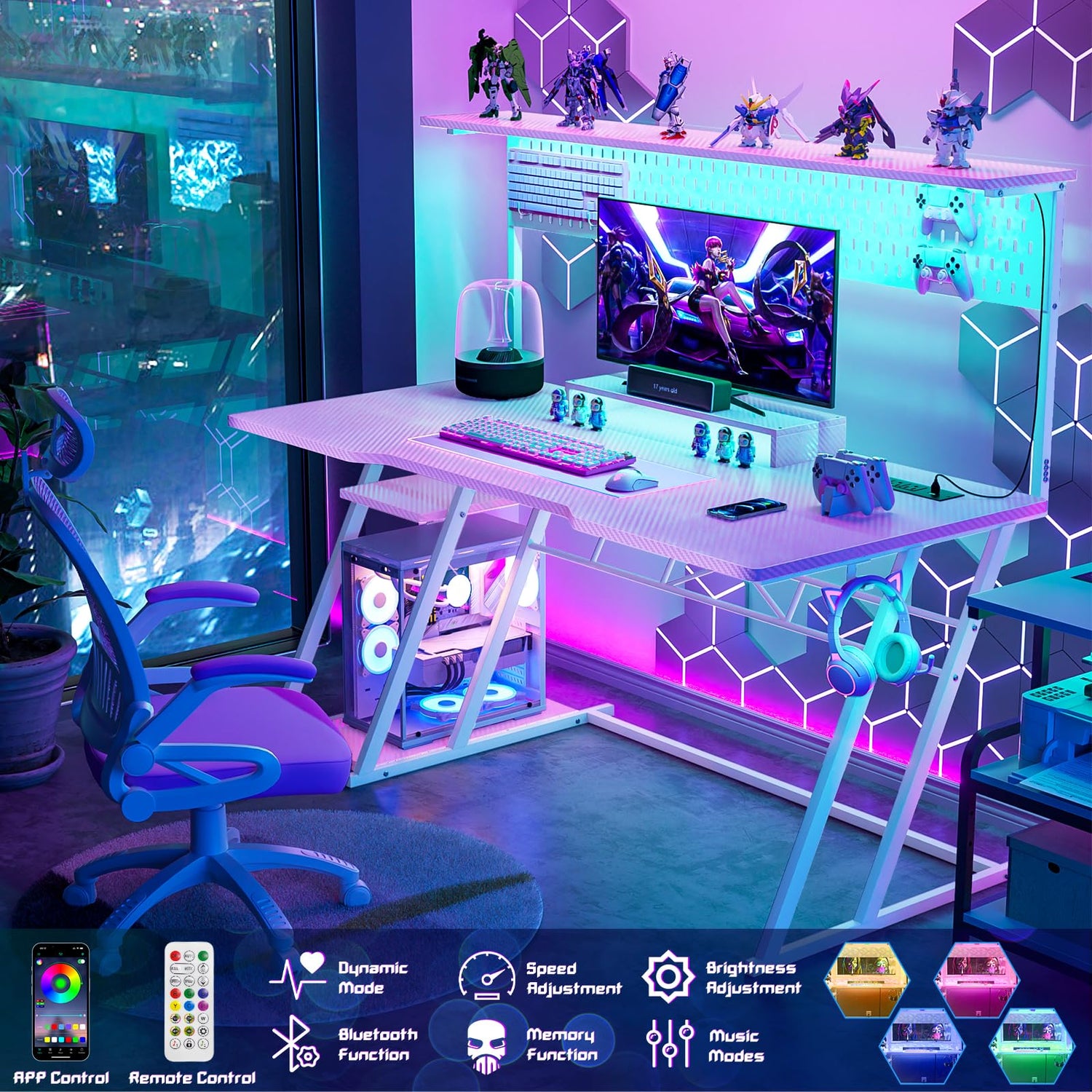 - STURDY AND FANTASTIC - Built with Z-form legs bases, the gaming table desk is very sturdy with two beam cross members between the legs for stability. The carbon fiber on this pink desk is very smooth and has a nice texture. This surface looks pretty sweet and shiny when the colorful led lights are brightening. This pink desk perfectly fits any gaming nook, bedroom, and home office space. Getting this pc gaming desk for kids, teens, or your sweetheart and it would be cool to turn the room into a game theme.