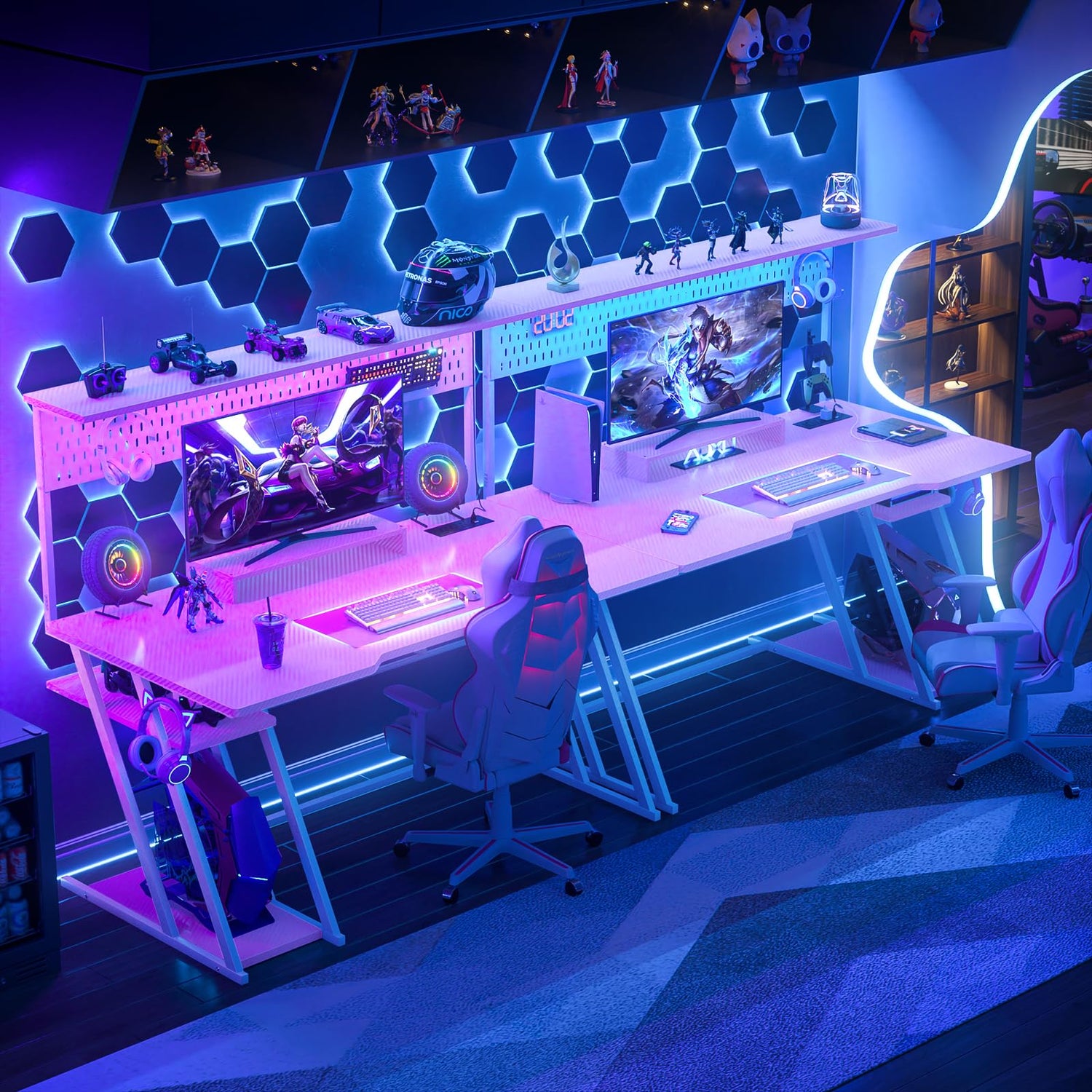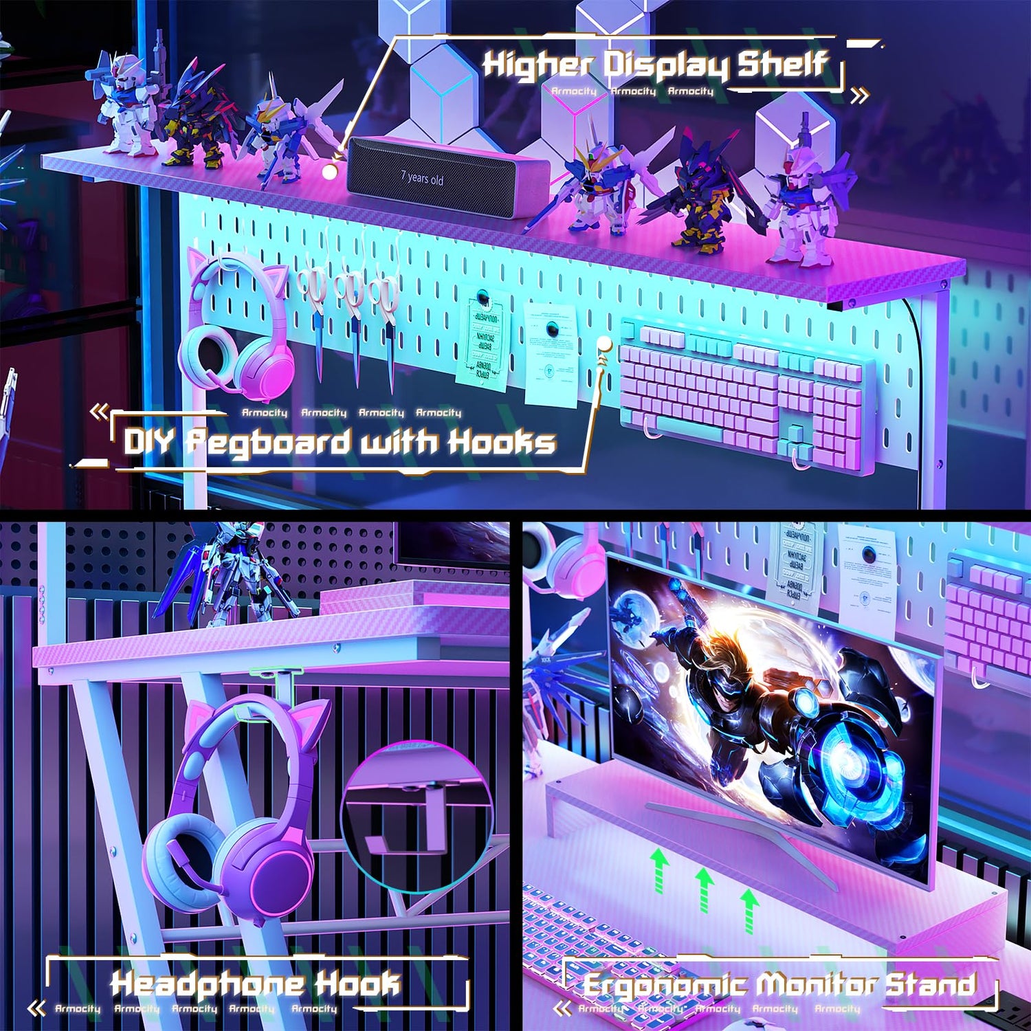 Details: Armocity gaming desk with hutch and storage shelves has plenty of room for gaming consoles and miscellaneous swag. It's enough to hold laptops and monitors as well as miscellaneous paperwork and other sundry items. Additional DIY pegboard (with 4 s hooks) will be a space saver assistant and give it a cool and standout look. The ergonomic arch on the front edge of this desk is angled so you can rest your arms. The raised monitor stand is designed to relieve the pressure on your neck and save more space. The reversible side rack underneath can be installed on the left or right side according to your usage habits. Also, the hanger for headphones can be mounted on either side of this pinkgamer desk. The charging tower next to the monitor stand makes your setup even more convenient. It's handy and you can put your monitor, speakers, mic, mouse, keyboard, and PS4 resting on the game table and charge them without a problem. The coolness of RGB LED lights will add more attractive elements. Static mode and 20 dynamic modes are flexible options for your gaming atmosphere. Built with Z-form legs bases, the gaming table desk is very sturdy with two beam cross members between the legs for stability. The carbon fiber on the desk is very smooth and has a nice texture. This surface looks pretty sweet and shiny when the colorful led lights are brightening. This pink desk perfectly fits any gaming nook, bedroom, and home office space. A lot of space on the actual desk for multiple things. Getting this pc gaming desk for kids, teens, or your sweetheart and it would be cool to turn the room into a game theme. Don't game? Using it as a generic study/writing/work desk will be also great.