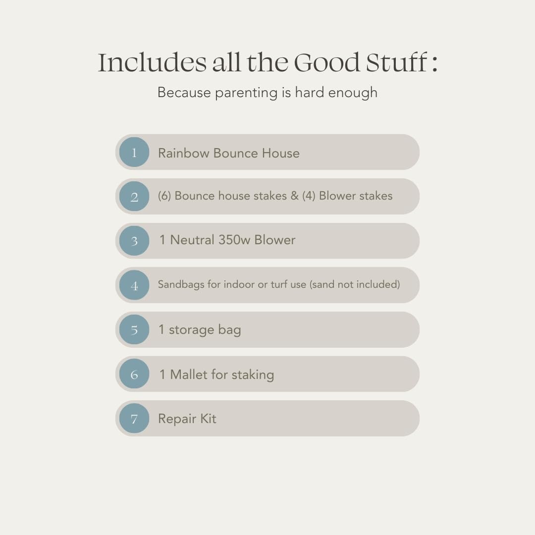 - Meet the Rainbow — where playtime is beautiful and gravity is optional. Whether you're hosting the sweetest playdate or keeping the kids entertained on a rainy day, this bounce house is pure joy in every jump. ✔️ Available in multiple sizes and colors to fit your space ✔️ Easy setup and takedown — inflate in minutes for hours of play! ✔️ Perfect for parties, playdates, or everyday fun ✔️ Made for indoor or outdoor use