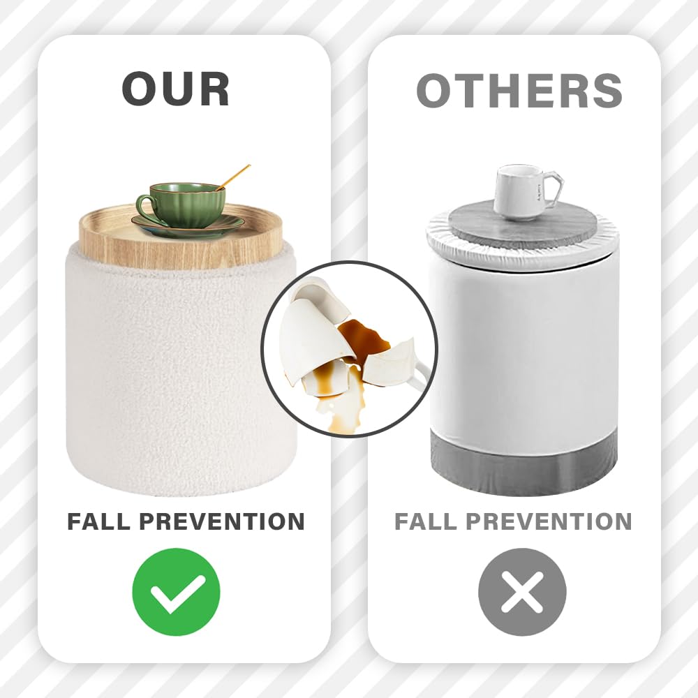 - ✨️ 【Storage Ottoman with A Removable Tray】The round ottoman is equipped with a removable tray, which allows you to treat this stool to a tea table. Flipping over the lid, you can put some desserts and cups to enjoy tea time. Since its wooden layer, this tray ensures high load capacity and easy maintenance.The protruding part at the edge of the plate can prevent the cup from accidentally falling off.