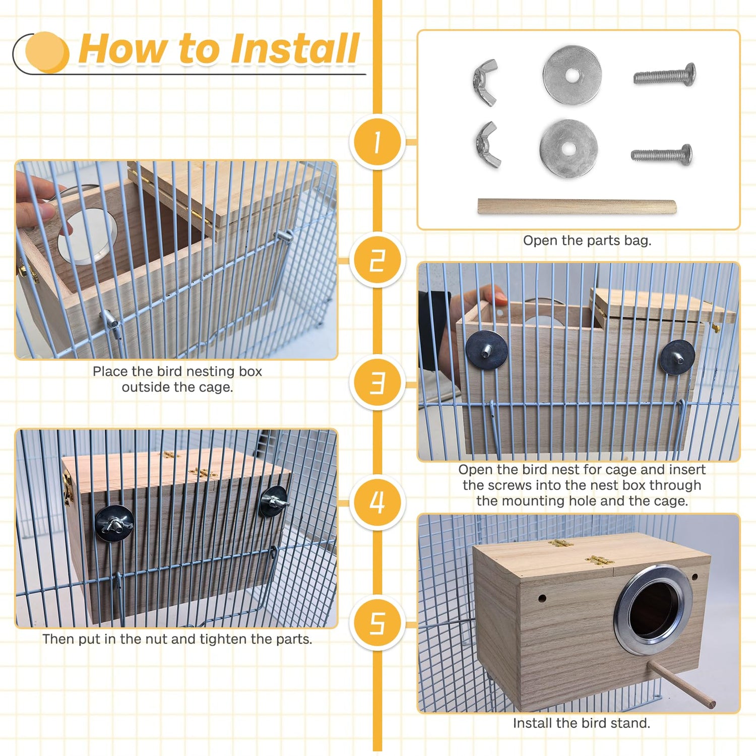 - Easy to Use: The parakeet nesting box is designed to create a comfortable and safe bird breeding environment. The smooth, circular entrance allows your bird to enter and exit easily without injury. The box is equipped with a bird stand, which is an ideal place for birds to roost and feed