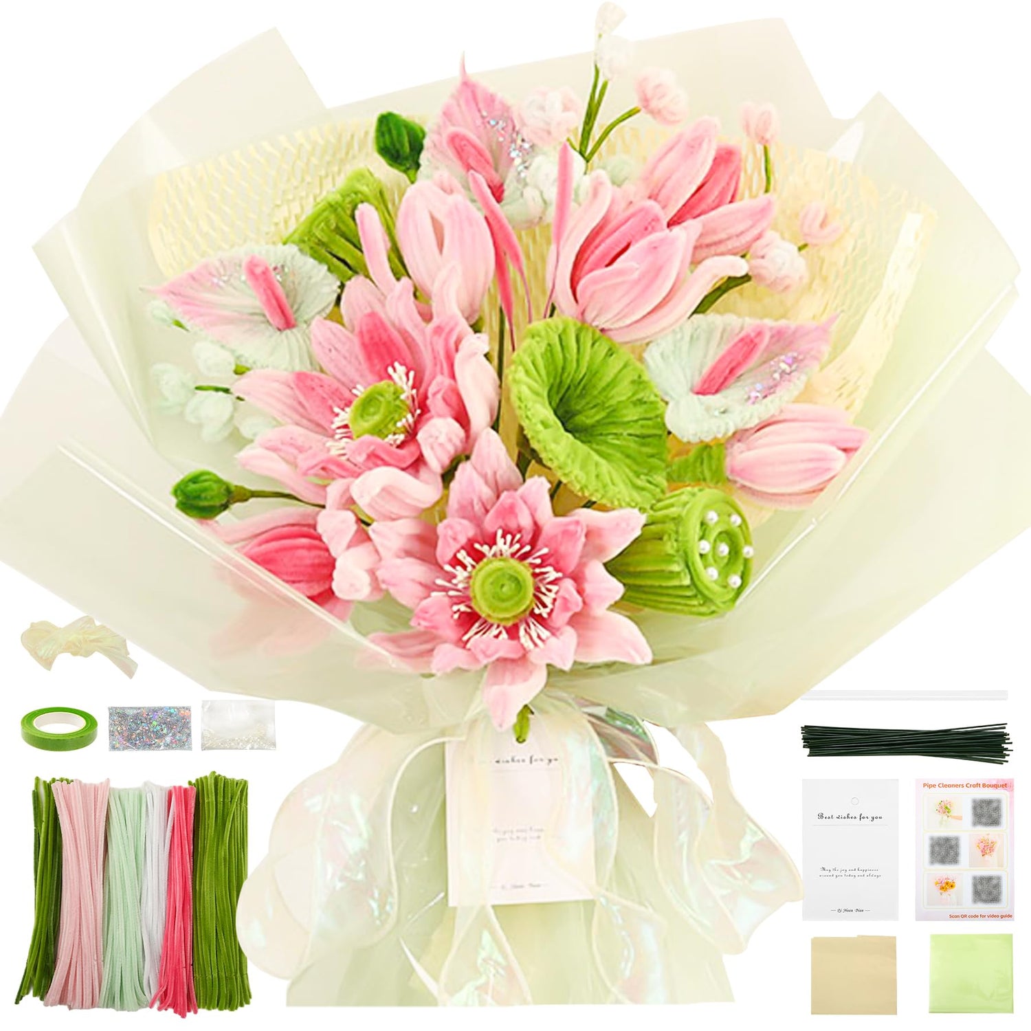- PIPE CLEANER FLOWER KIT FOR BEGINNERS -This is a versatile DIY pipe cleaners flower bouquet kit includes all the necessary accessories and a detailed video tutorial. The video covers step-by-step instructions for making roses, sunflowers, tulips, lilies, and lavender more, It’s easy to understand and follow and perfect for beginners.