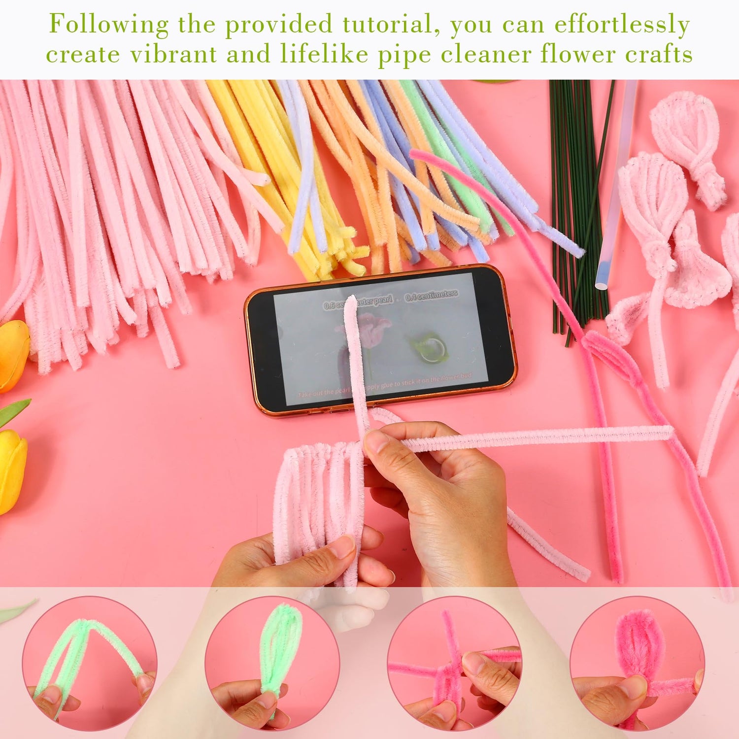 - ALL-IN-ONE PIPE CLEANER FLOWER KIT - This chenille stems pipe Cleaner flower kit includes all the pipe cleaner craft supplies for flower bouquet( 200 pipe cleaners, each chenille stem is 11.5 inches long, video tutorial, 28 pieces green craft wire, gardening tape, decorative glitter and eyeshadow, pearls, 3 bouquet wrapping papers, ribbon, hot melt glue stick).