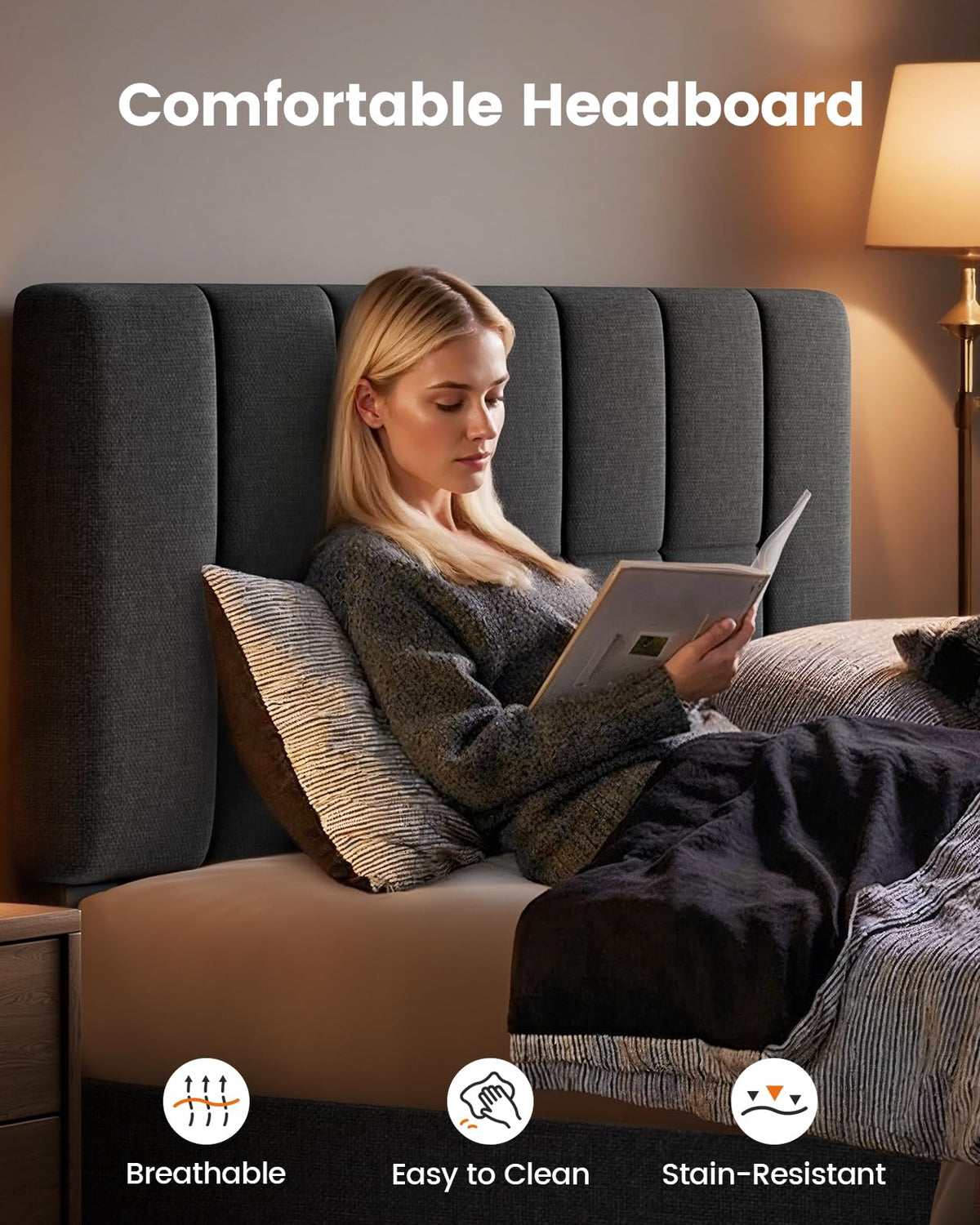 - ๐๐ง๐๐๐ซ๐๐๐ ๐๐ญ๐จ๐ซ๐๐ ๐&๐๐๐ฌ๐ฒ-๐ญ๐จ-๐๐ฅ๐๐๐ง:The grey bed frame queen features a10" Underbed Storage Space and 6.5" Robot Vacuum Clearance, allowing easy access for robotic vacuums. The ample space underneath makes cleaning convenient. The ideal height also makes this queen platform bed frame with headboard accessible and safe for all family members.