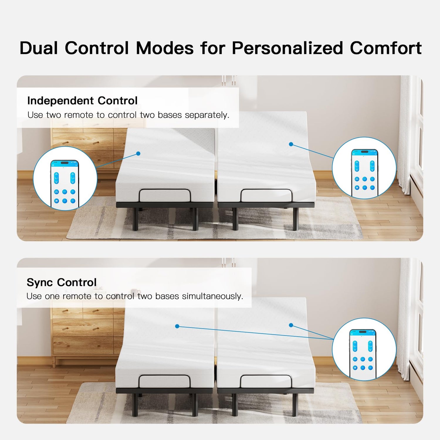 - Soothing Massage: Enjoy a relaxing upper body & leg massage, powered by the dual motors of this electric bed frame. There are three massage modes and three intensity levels to help alleviate muscle tension, reduce stress, and improve circulation—all easily managed through the SmartBed app or included remote control.