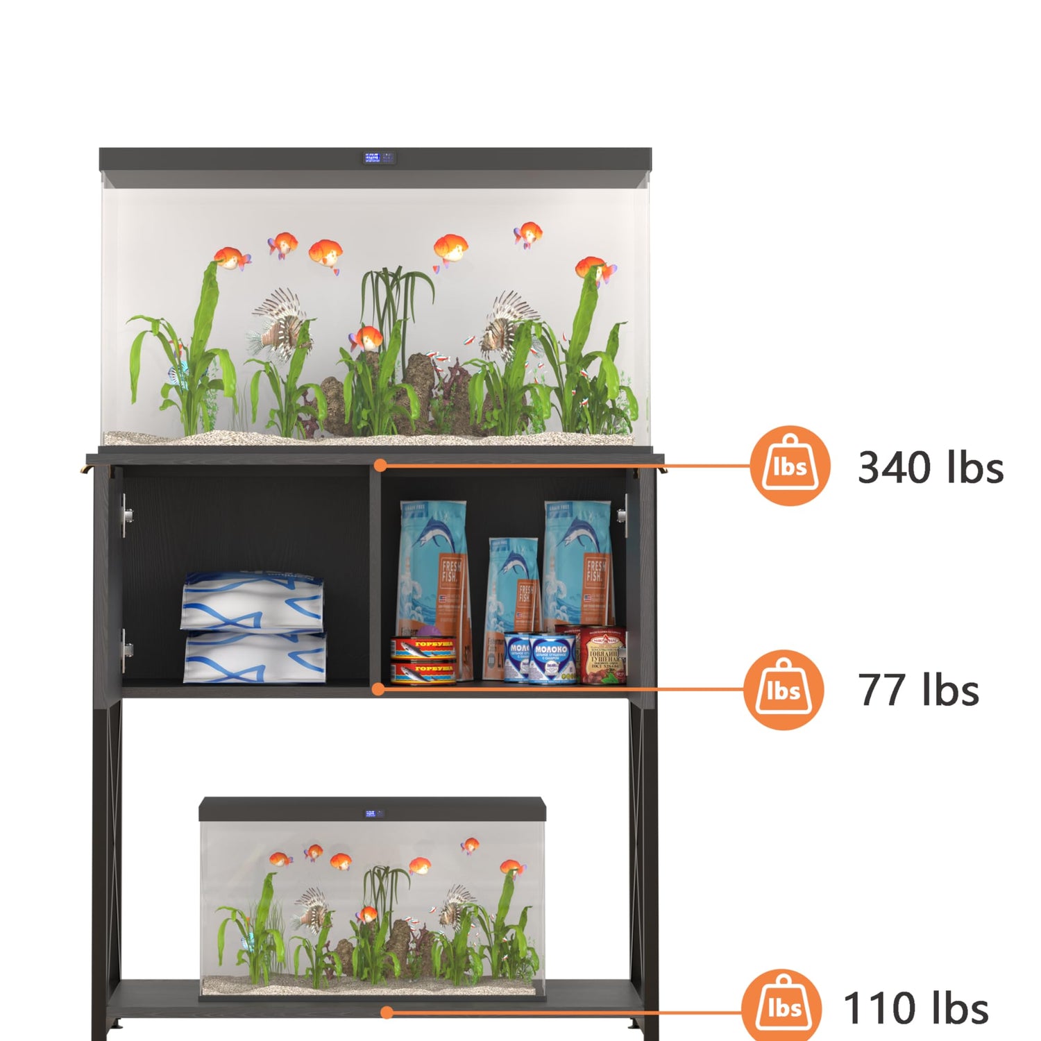 - 【SUPERIOR WEIGHT-BEARING & DURABILITY】Made of powder coated thick steel and sturdy MDF, the top load-bearing 340lbs and the bottom load-bearing 110lbs ensure the stability and durability of the fish tank stand, so you can use it with peace of mind.
