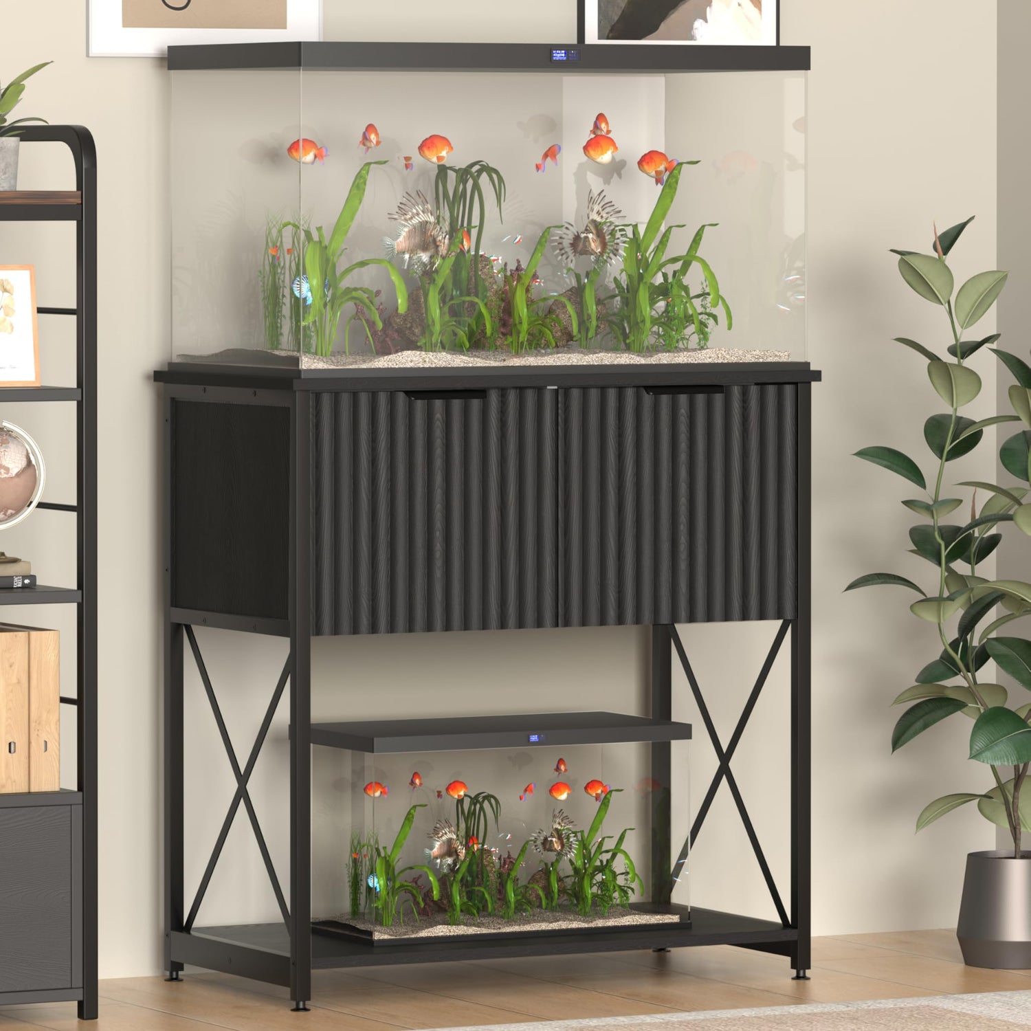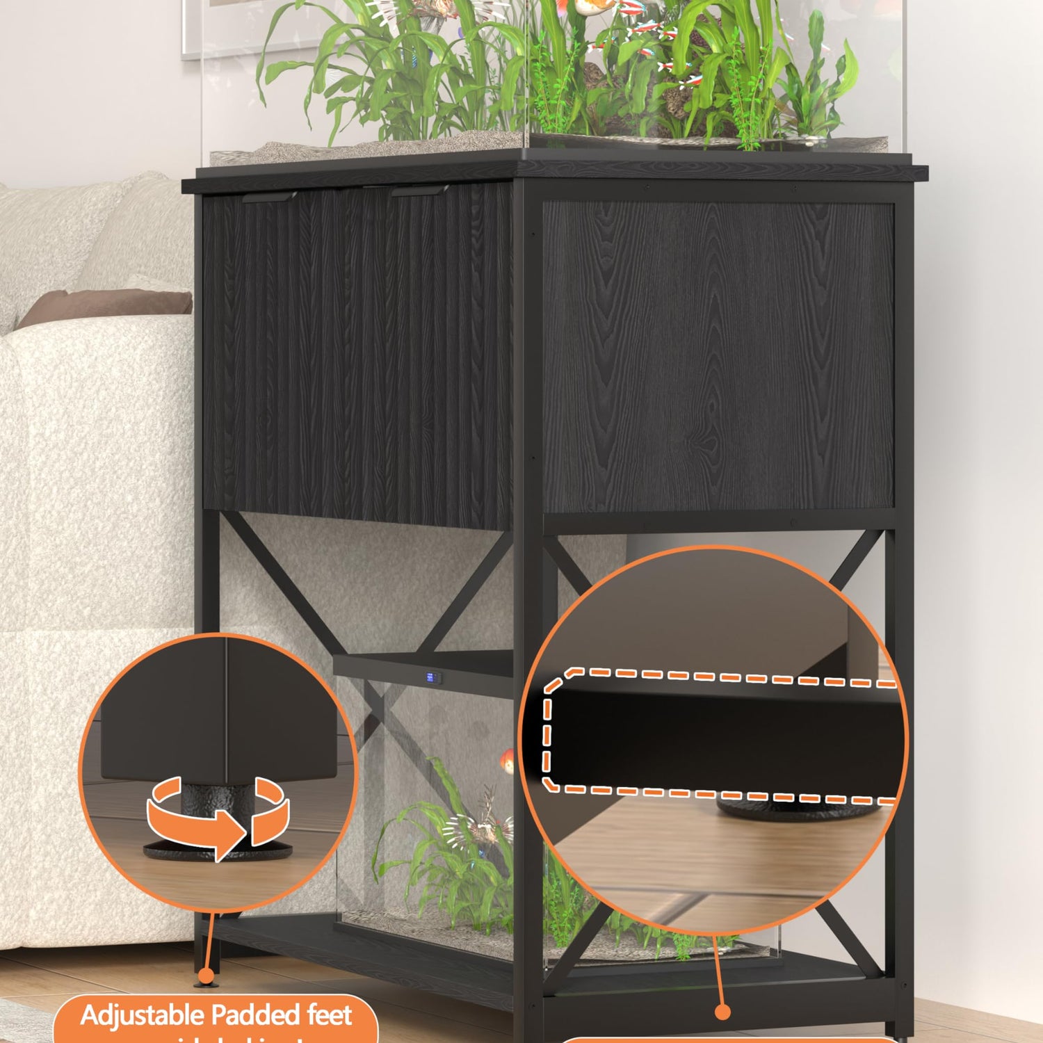 - 【SPACE OPTIMIZING DESIGN】The top displays the fish tank stand, and the bottom can be used for storage or decoration, effectively utilizing the space to meet your pursuit of a neat and personalized home. The bottom padded feet are adjustable and can be adjusted according to your needs.