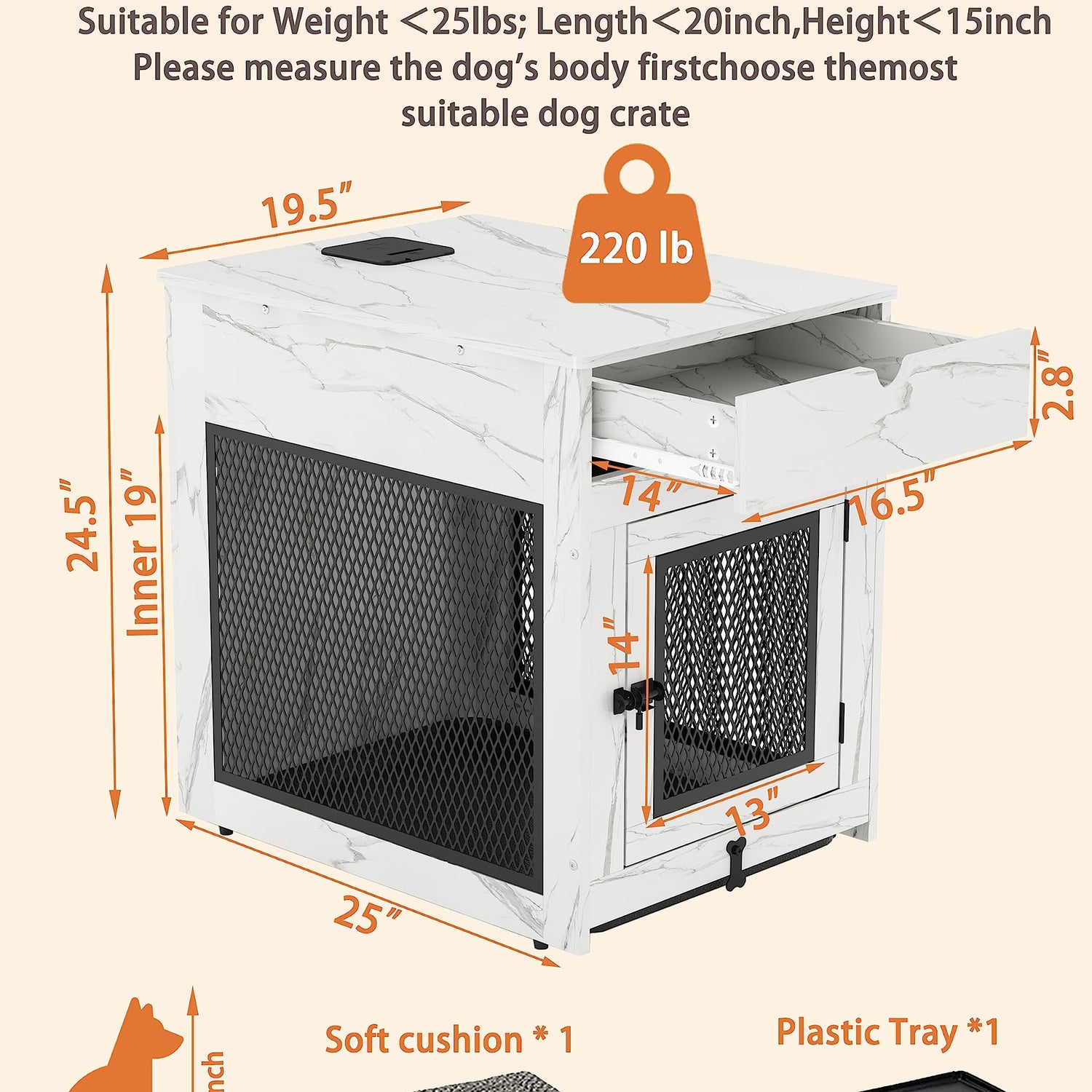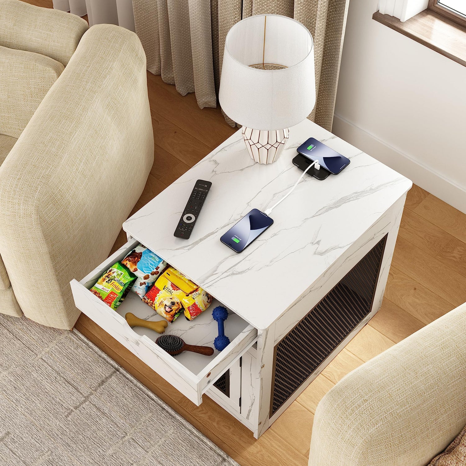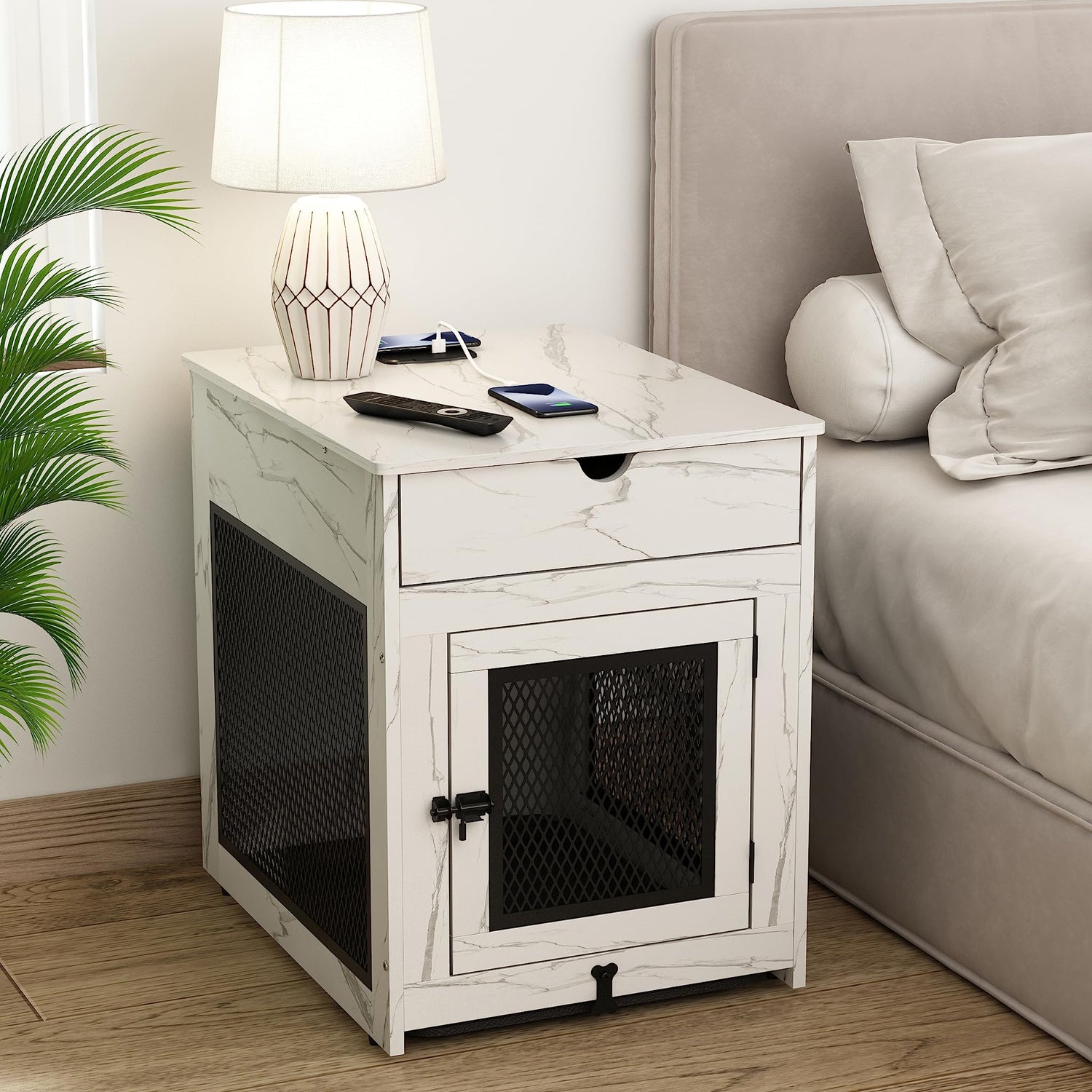 Piskyet Dog Crate Furniture,Wooden Dog Crate End Table with Storage Drawer&Cushion&Tray, QC3.0 Wireless Fast Charging&Dual USB, Dog Crate Indoor Kennel for Small Dogs - Marble White