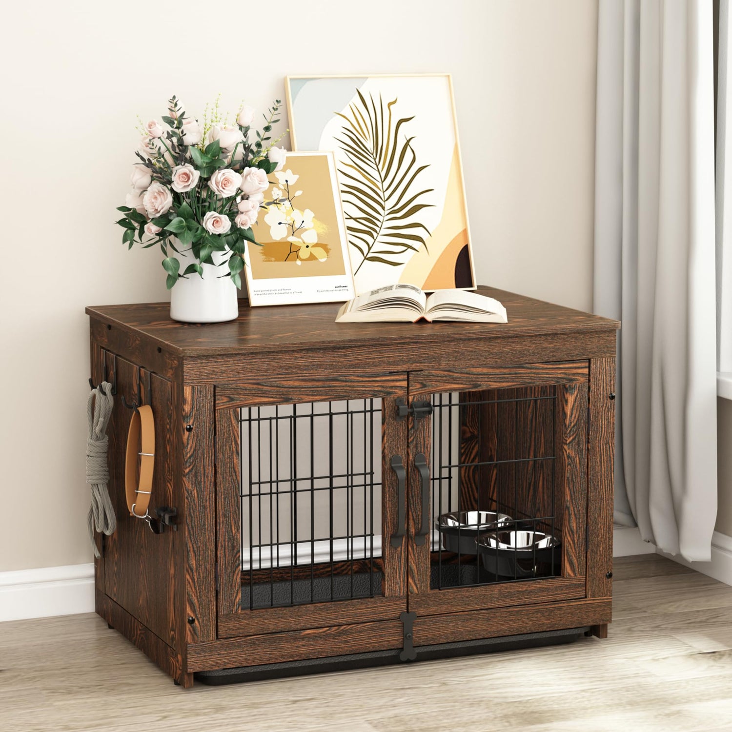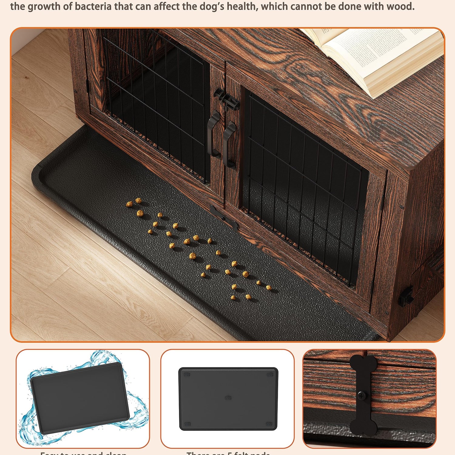 - 【Easy-to-clean Tray】: The interior of the dog crate needs regular disinfection and cleaning of fur and dirt. The durable, odor-resistant tray can be easily pulled out and cleaned in case of accidents, something a wooden board can't do. (The tray comes with felt pads underneath to protect your floor from scratches)