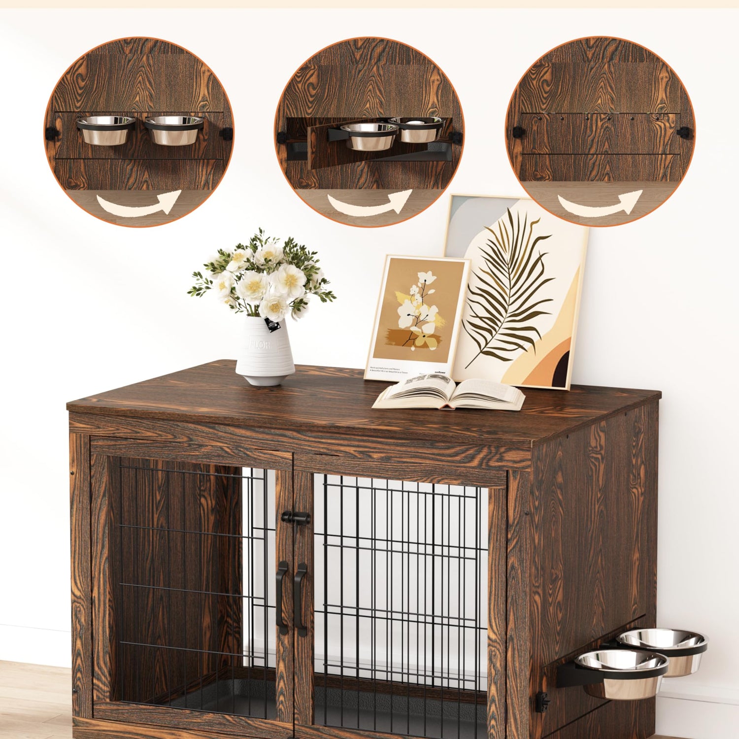 Piskyet Wooden Dog Crate Furniture with 360°Rotatable Removable Dog Bowls, Dog Crate End Table with Tray, Double Doors Dog Kennels for Dogs(M:31.8" L*22.1" W*24.1" H, Rustic Style)