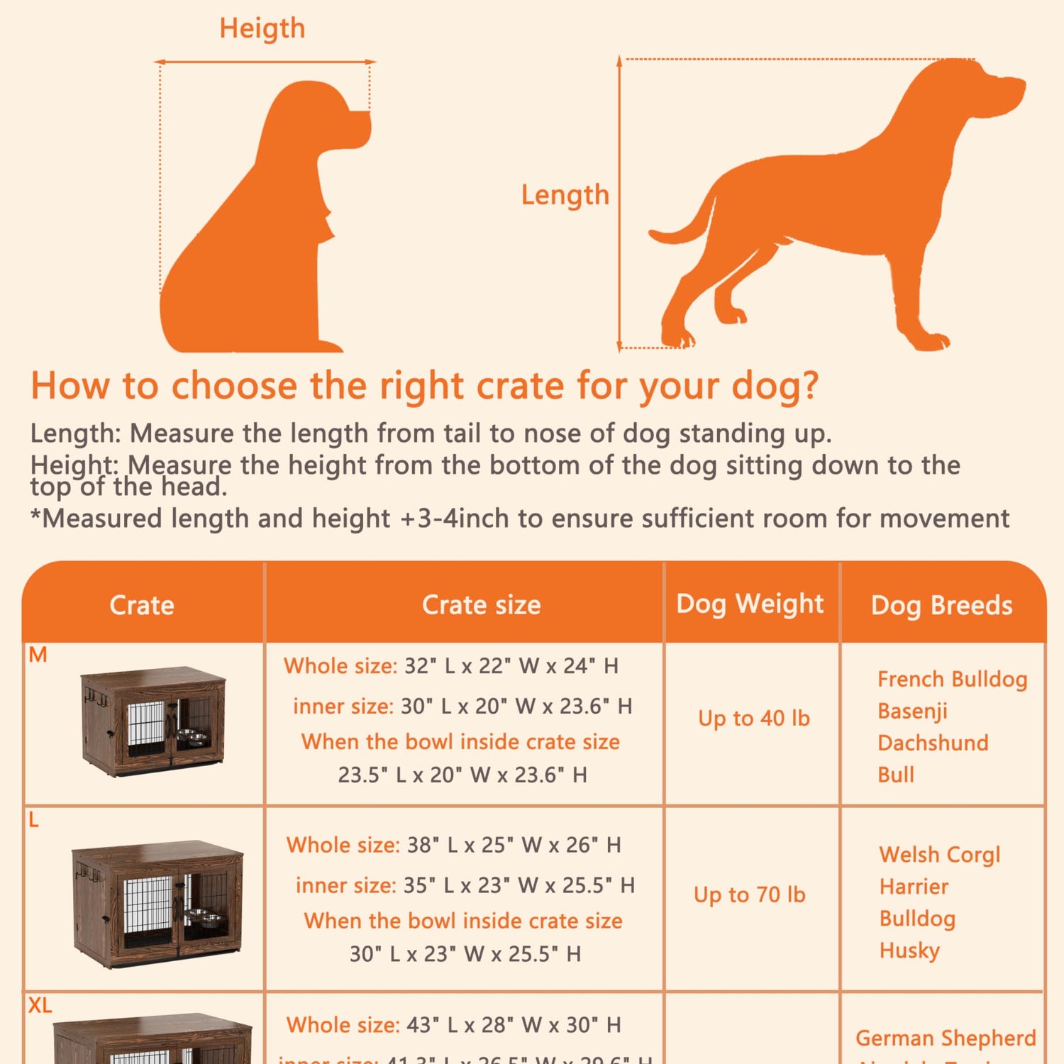 - 【Recommended Size】M inner size:30"L*20.1"W*23.7"H. It's perfect for weight up to 35 pounds.L inner size: The interior space of the dog crate is 35.9*23.1*25.7 inches. It's perfect for weight up to 60 pounds.XL inner size: 41.5*26.5*29.5 inches. It's perfect for weight up to 90 pounds.