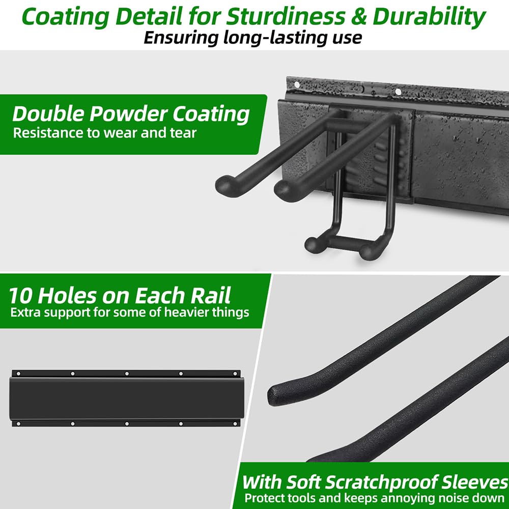 - Versatile Functionality: The garage organization is equipped with six double-layer hooks and three rails. Every rail is engineered to fit the standard 16-inch on-center stud spacing, perfect for garages, sheds, and workshops in need of robust organization