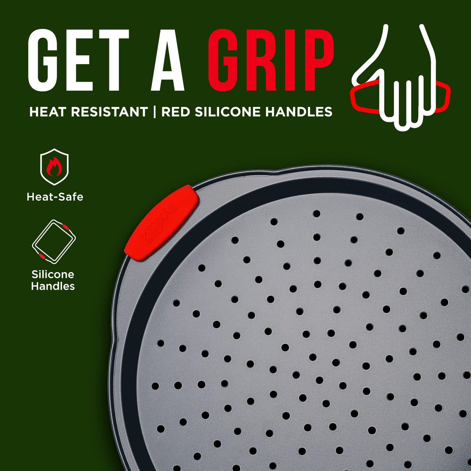 - PIZZA TRAY – achieve the perfect pizza thanks to our pizza pan with holes. The round grey design and the oversized silicone handles make it easy to use for all standard-size pizzas. Whether you buy your pizzas from the store or make them from scratch at home, you can enjoy a crispy crust and perfectly cooked base every time