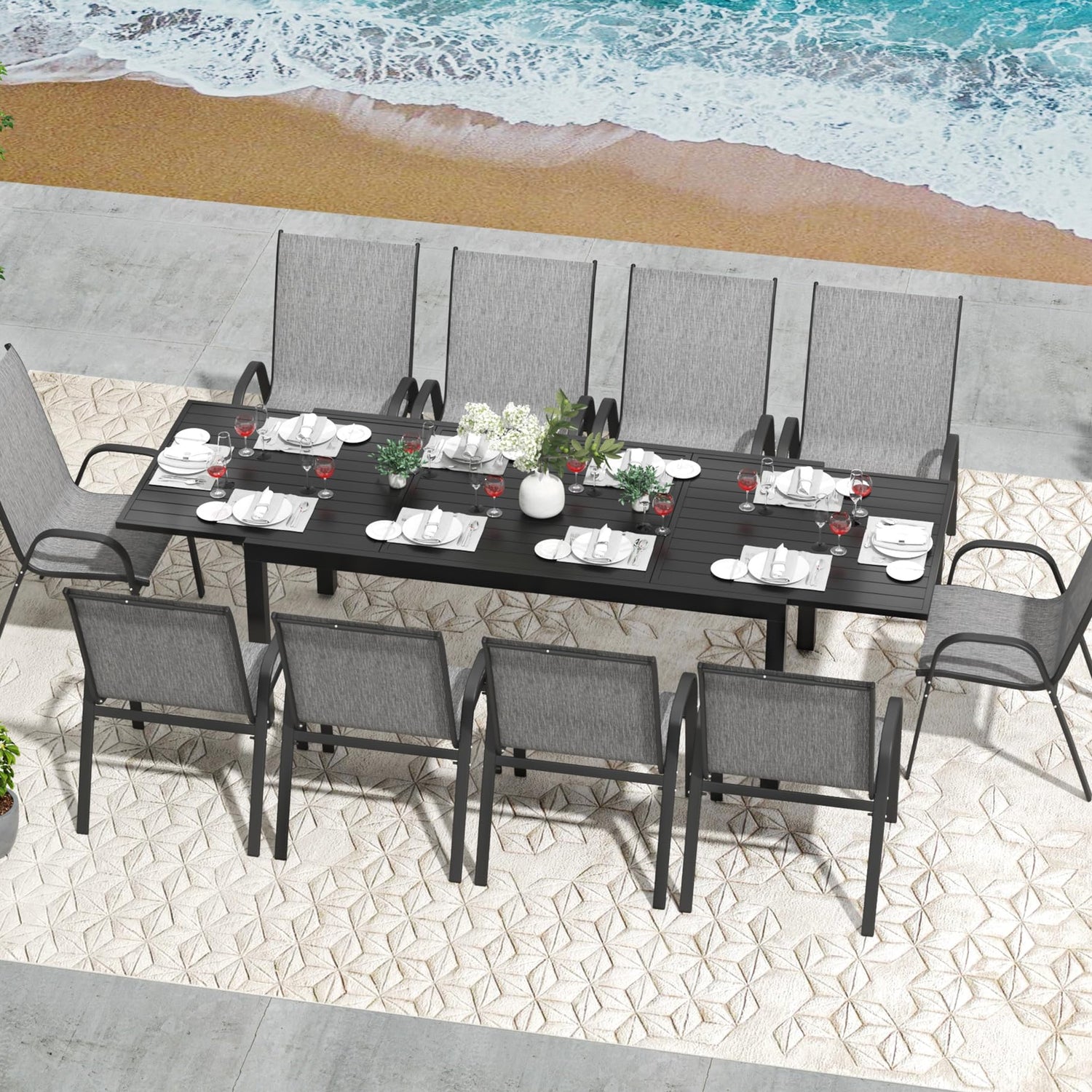 PIZZELLO 11 Pieces Outdoor Dining Set, 106" Aluminum Extendable Patio Dining Table w/ 10Pcs Stackable Textilene Chairs, All Weather Outdoor Table and Chairs Sets for Backyard, Garden and Deck