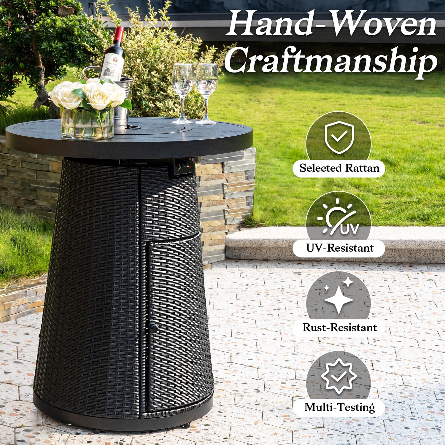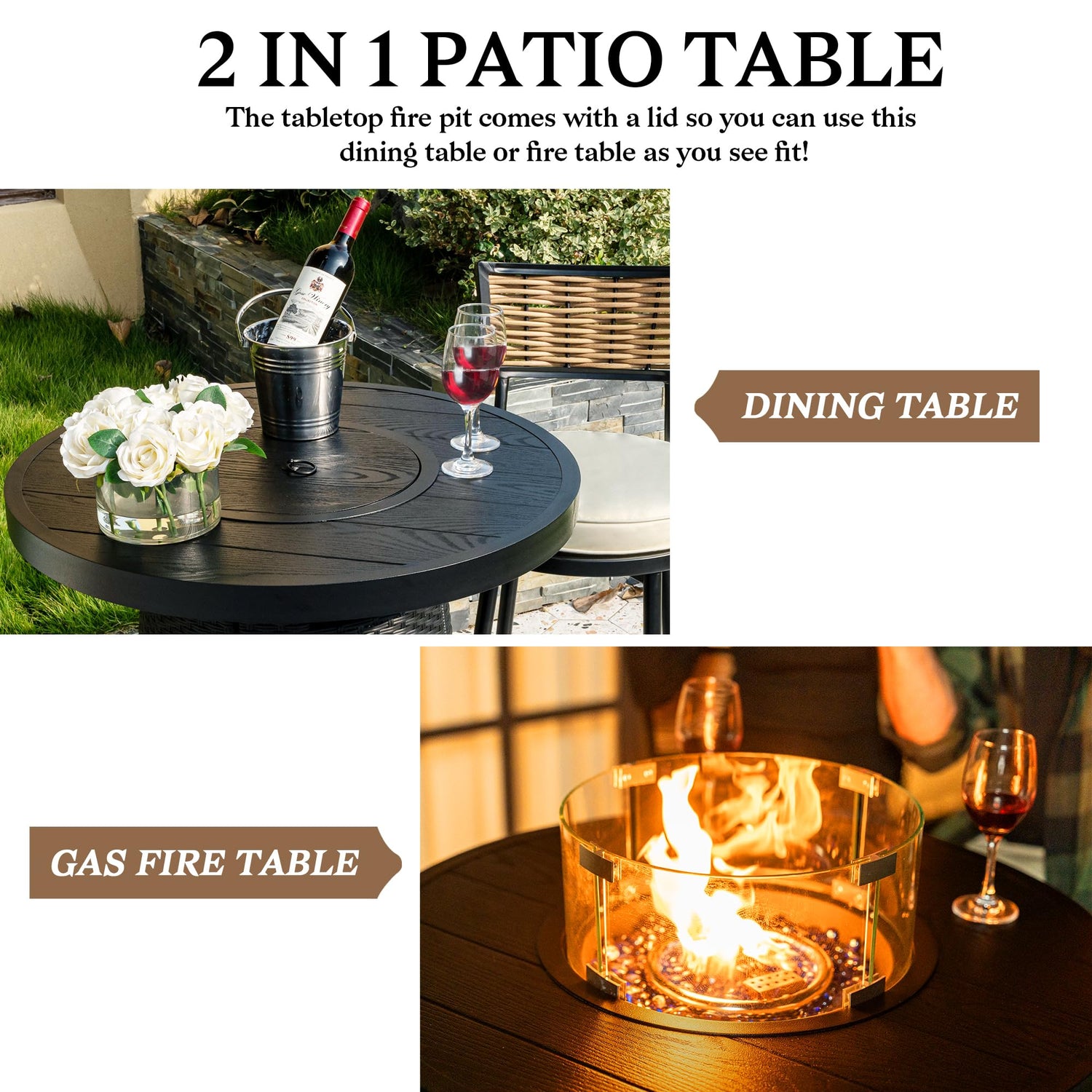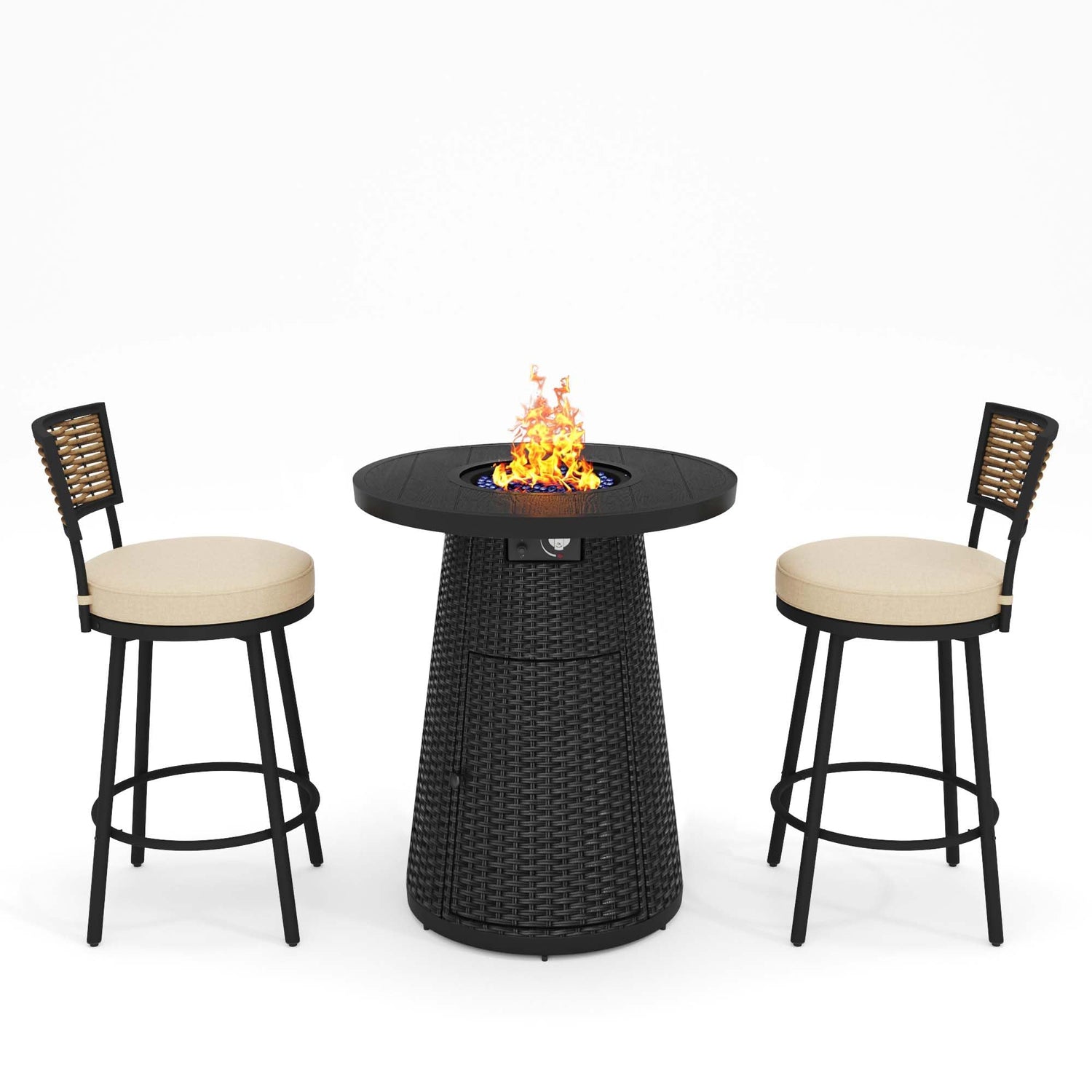 - Versatile Furniture Set - Comes with round wicker firepit table and 2 swivel bar chairs, this 3 pieces outdoor conversation set offers much warmth and convenience to you and your friends while chatting. Not only can be applied as fire table and chair sets but also as a patio dining sets, perfect for your garden, deck, balcony and more.