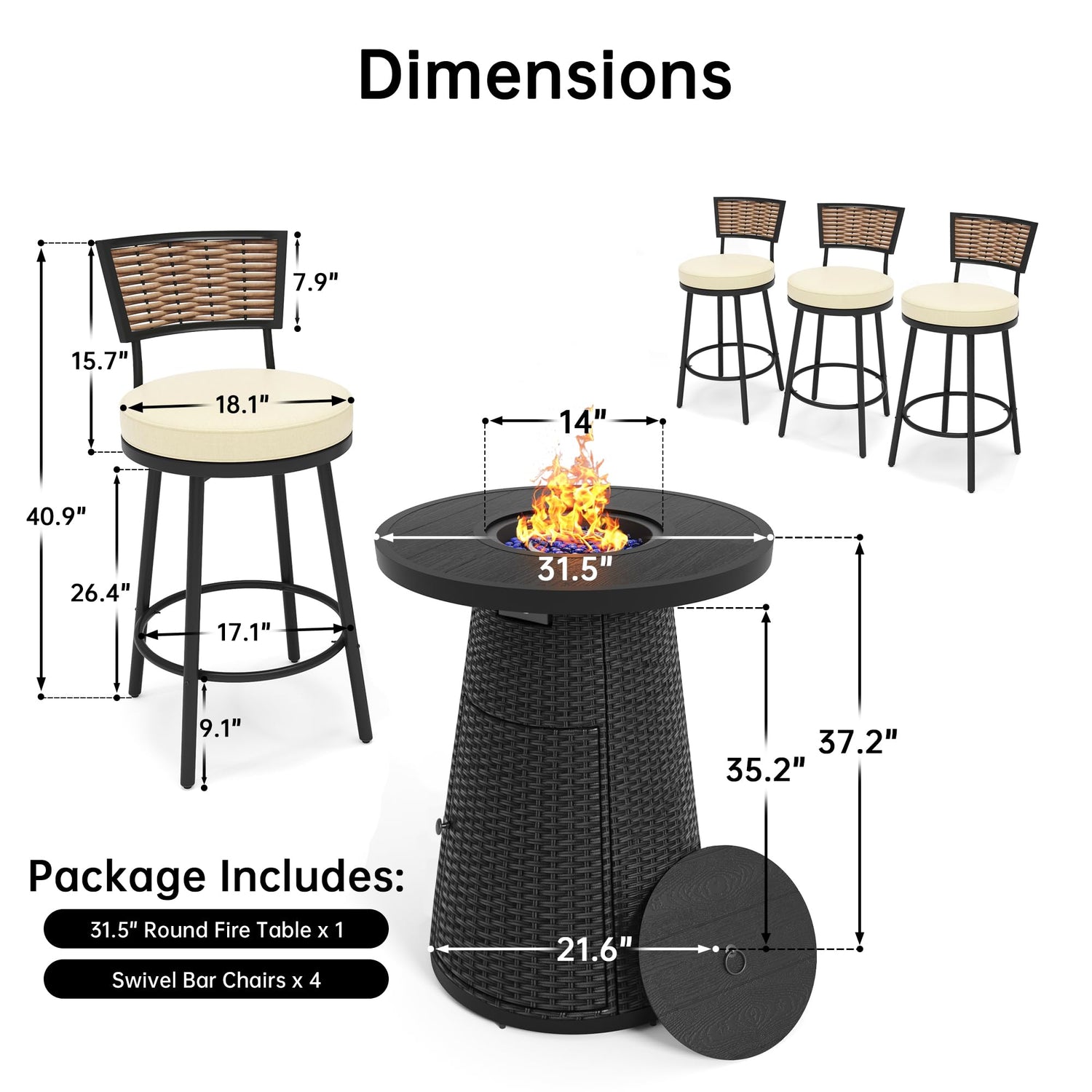 - Versatile Furniture Set - Comes with round wicker firepit table and 4 swivel bar chairs, this 5 pieces outdoor conversation set offers much warmth and convenience to you and your friends while chatting. Not only can be applied as fire table and chair sets but also as a patio dining sets, perfect for your garden, deck, balcony and more.