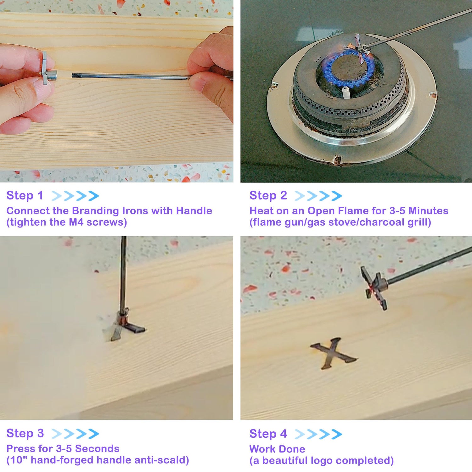 - 【Easy to Use】 ➤ Connect the branding irons with handle ➤ Heating Branding Iron on open flame for 3-5 minutes ➤ Press on your craft about 3-5 second ➤ Work done, enjoy your handcraft works.