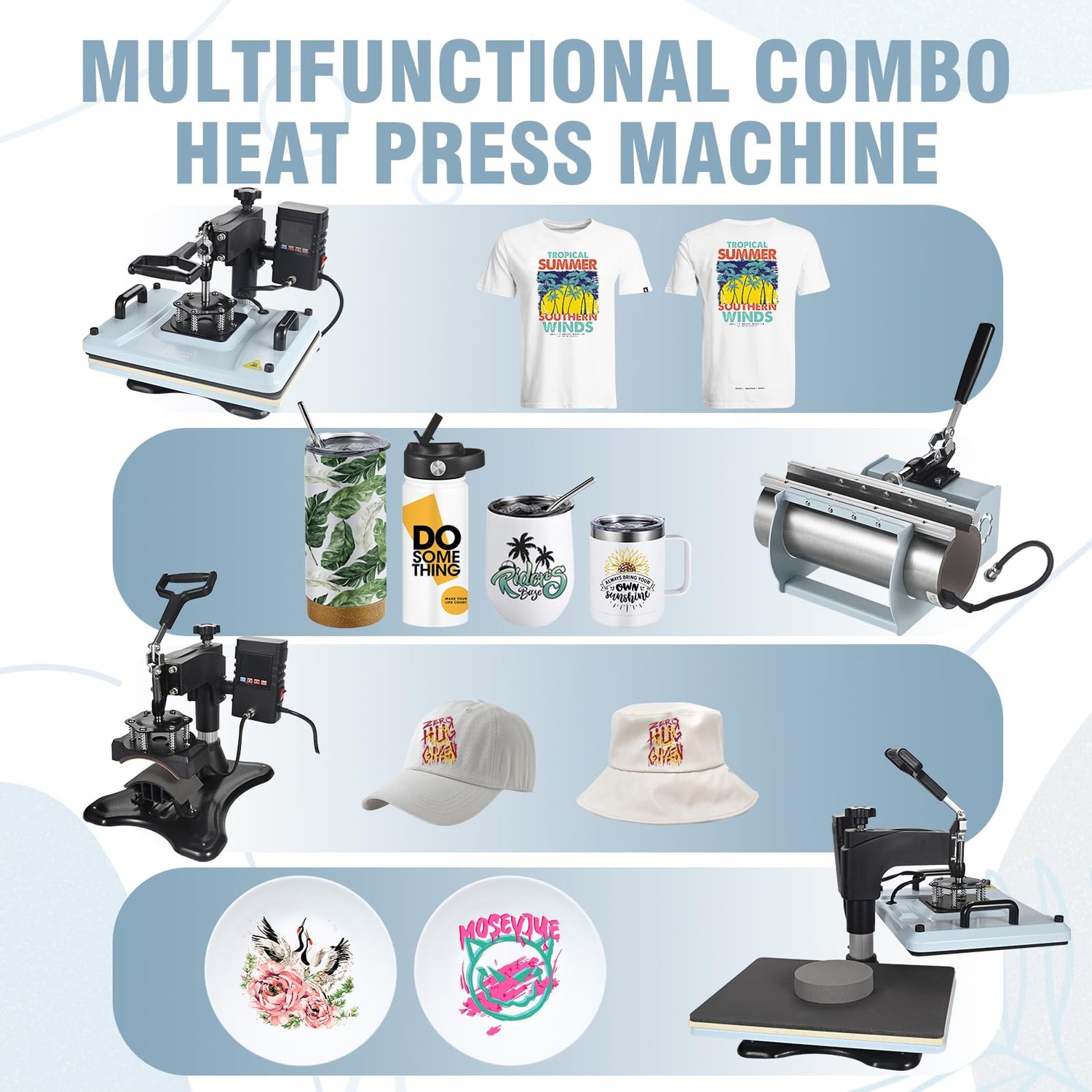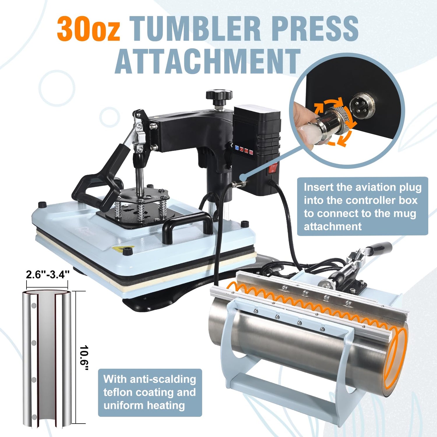 - 【Heat Press 5 in 1 with 30OZ Tumbler Press】Package includes 12" x15" Heat Press Machine for T-shirt, 6.7"x 3.3" Hat Press, 30oz Tumbler Press, 5"/6" Plate Press. The detachable heating attachment measures 10.6" in length and has a diameter range of 2.6" - 3.4". It can be printed 2PCS 11/15oz mugd and one 20oz/30oz tumbler simultaneously