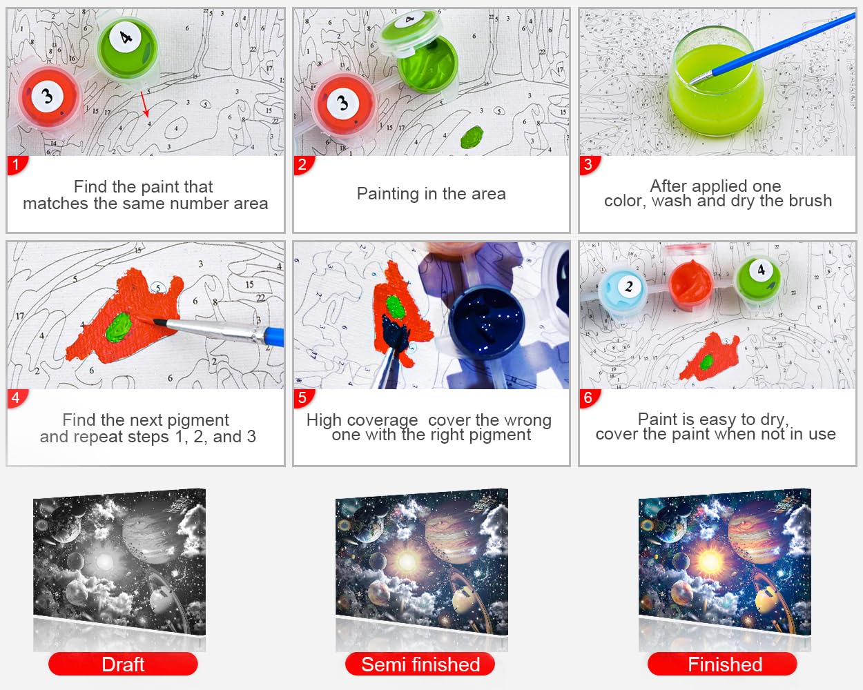- Eco-Friendly Materials: MOGYN uses safe acrylic paint adult paint by number and high quality canvas, easy to color and save. We provide enough color pigments, you don't need to mix paint, cover the number with just one coat of paint by number. When you accidentally use the wrong color, just cover with the correct color paint.