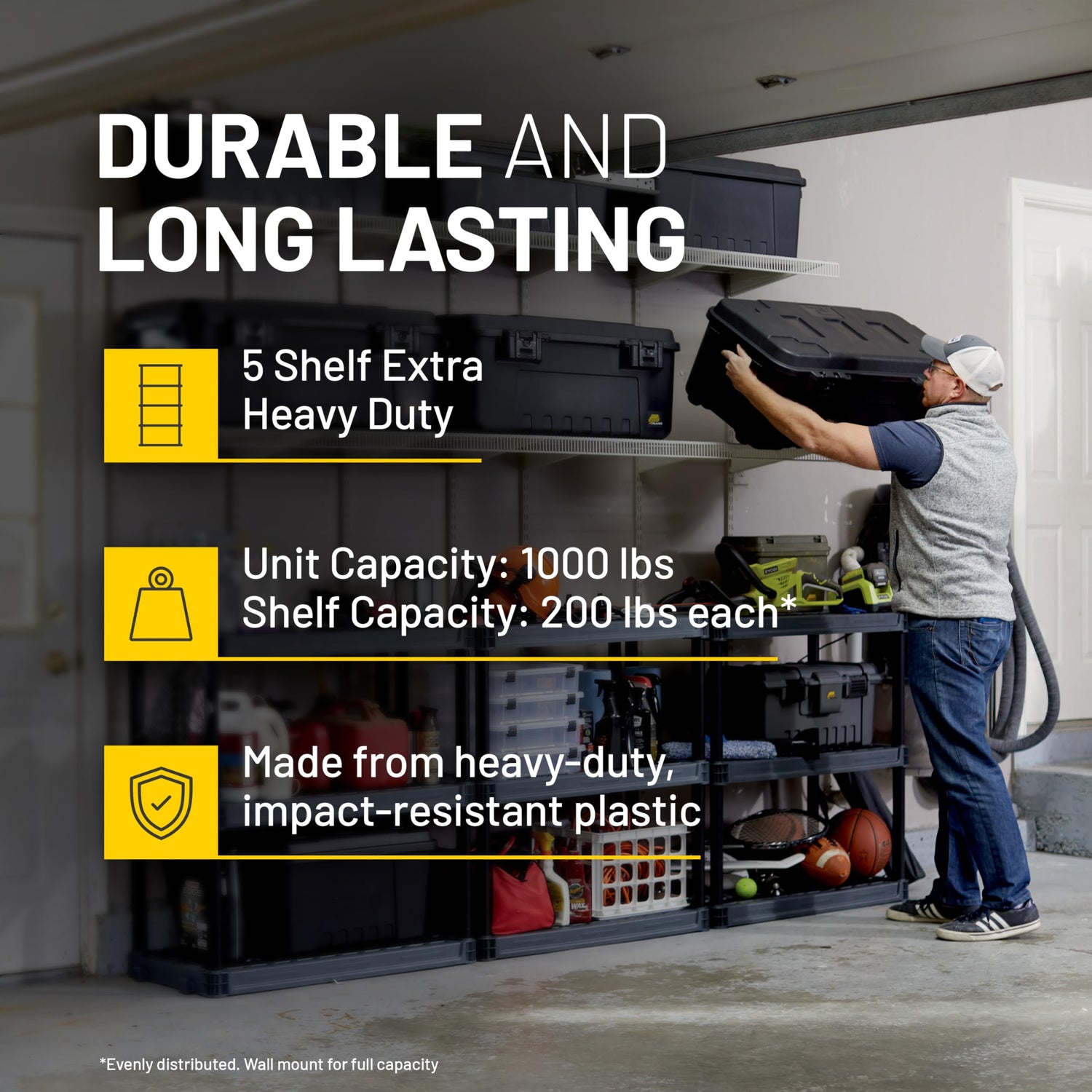 - 1000LB STORAGE CAPACITY: Each of the 5 plastic shelves has a maximum weight capacity of 200lbs. The full shelving unit can easily accommodate up to 1000lbs of total weight.
