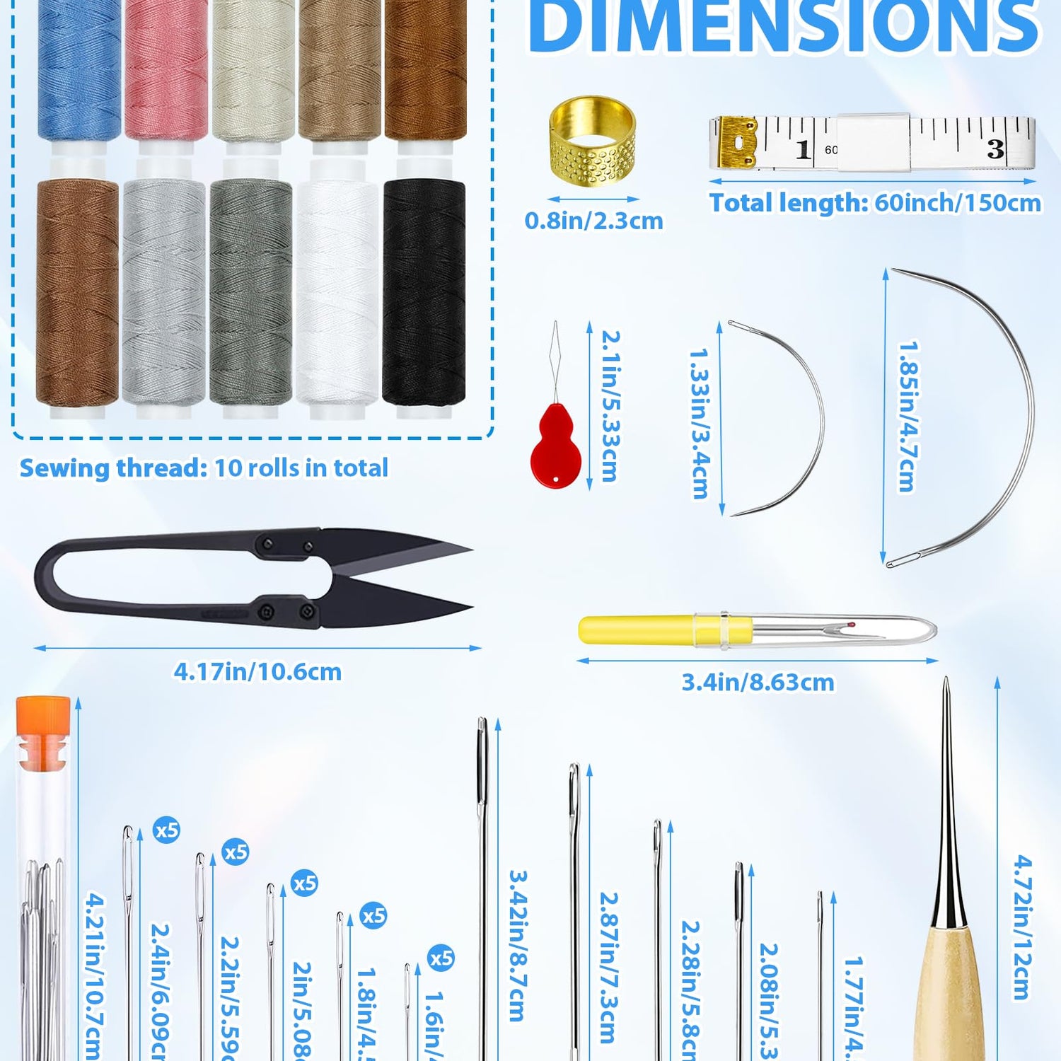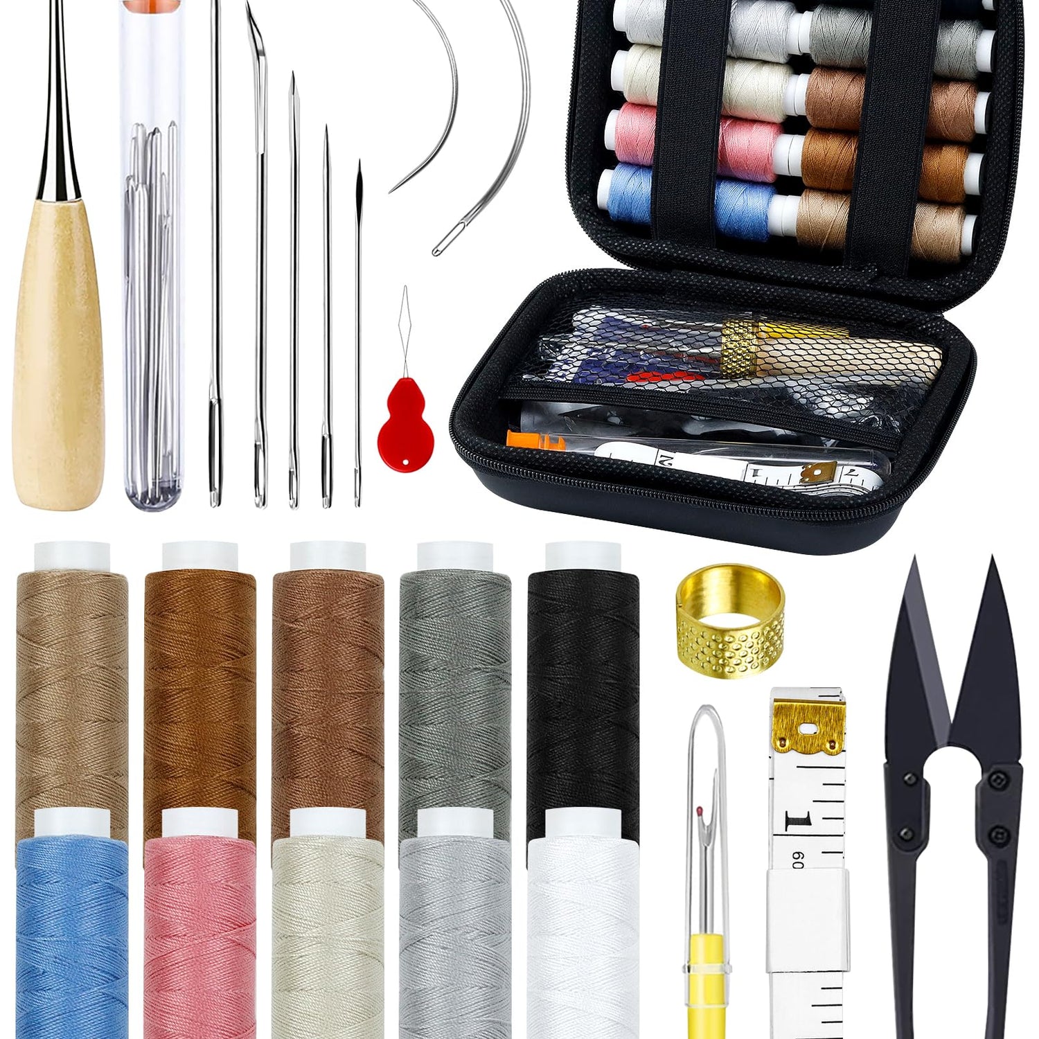 - 【Heavy Duty Sewing Kit】- This comprehensive sewing kit includes 32 leather sewing needles, 10 leather sewing threads (30 m/color), a needle bottle, an awl, a tape measure, scissors, and a sewing thimble.