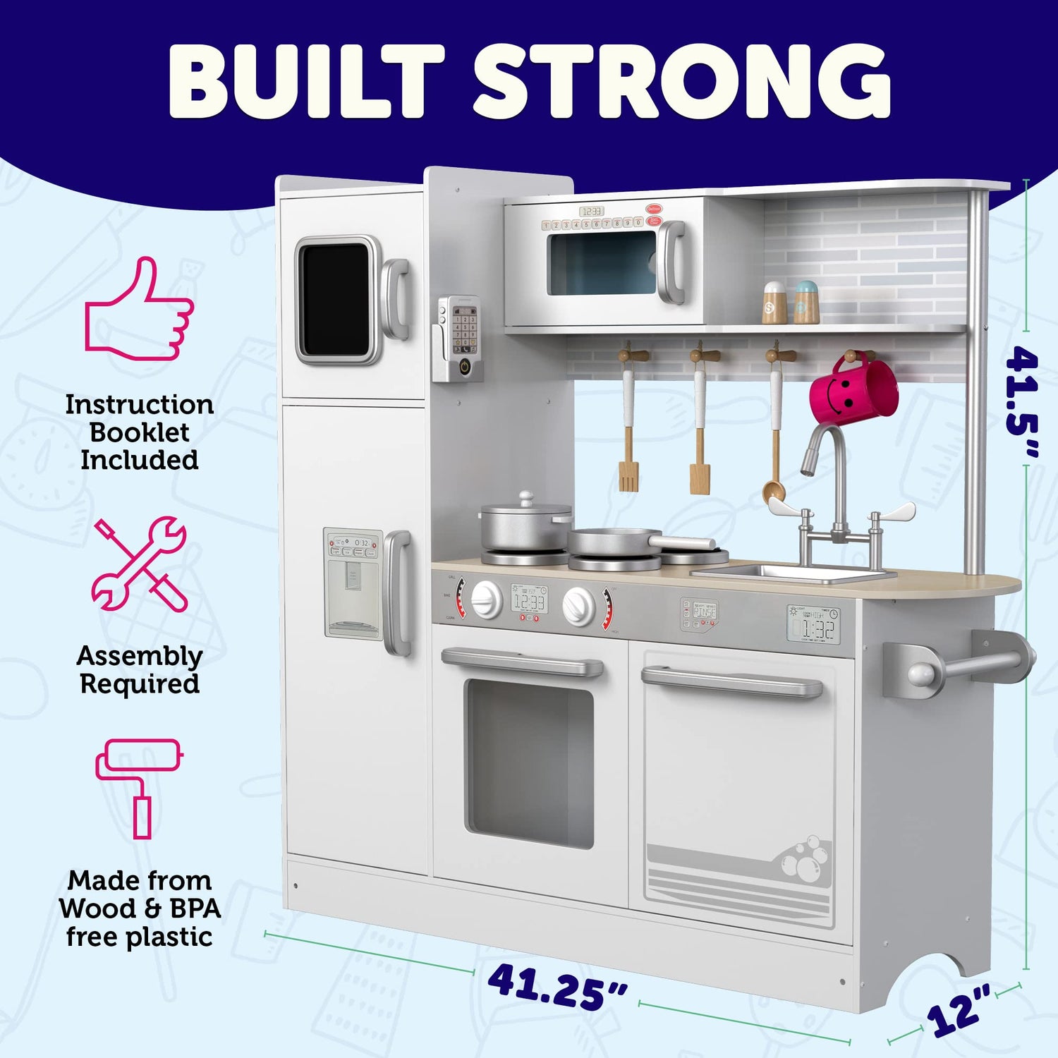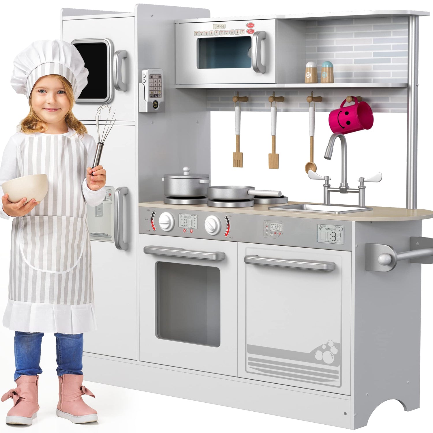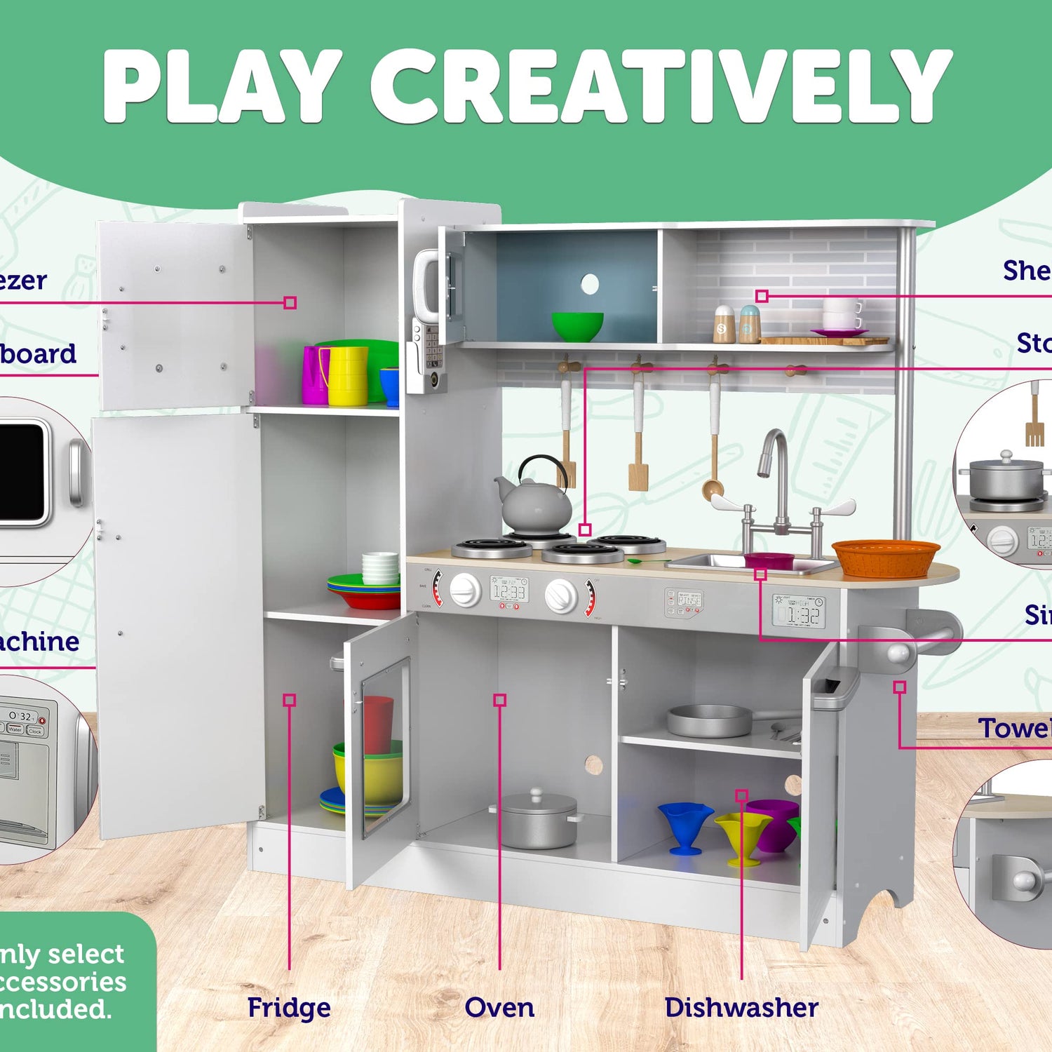 - EASY TO ASSEMBLE AND CLEAN: Our Play kitchen comes with pre-installed hinges and has removable parts that can be easily washed to keep the kitchen set for kids tidy. Our pretended kitchen is a great opportunity for your children to learn the value of being responsible for their own mess and cleaning up via play.
