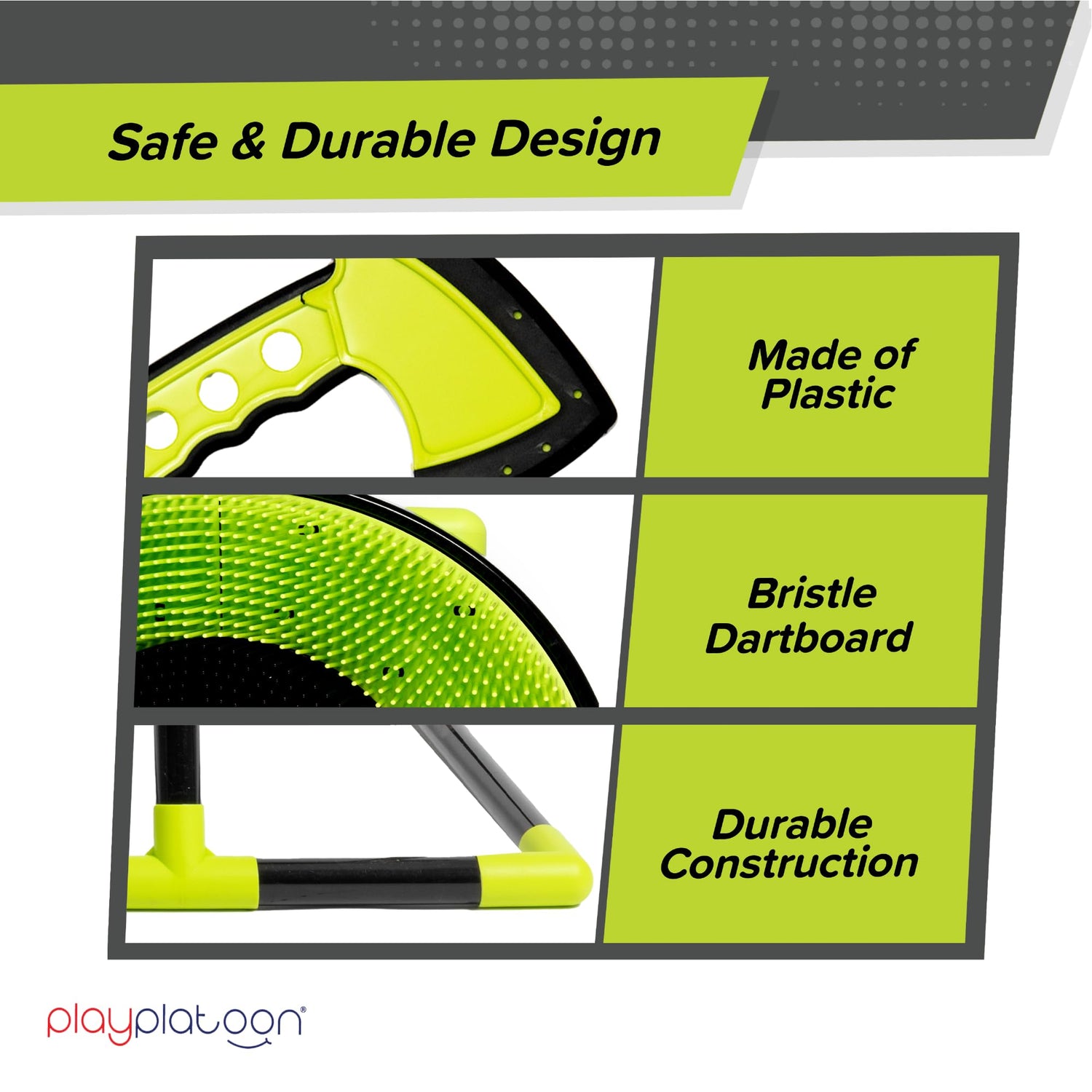 - VARIETY IN EVERY THROW: Experience a range of throwing options with the included 3 plastic hatchets, 3 throwing stars, and 3 darts. The bristle dartboard provides a durable target for accurate throws, making it a perfect game for all skill levels.