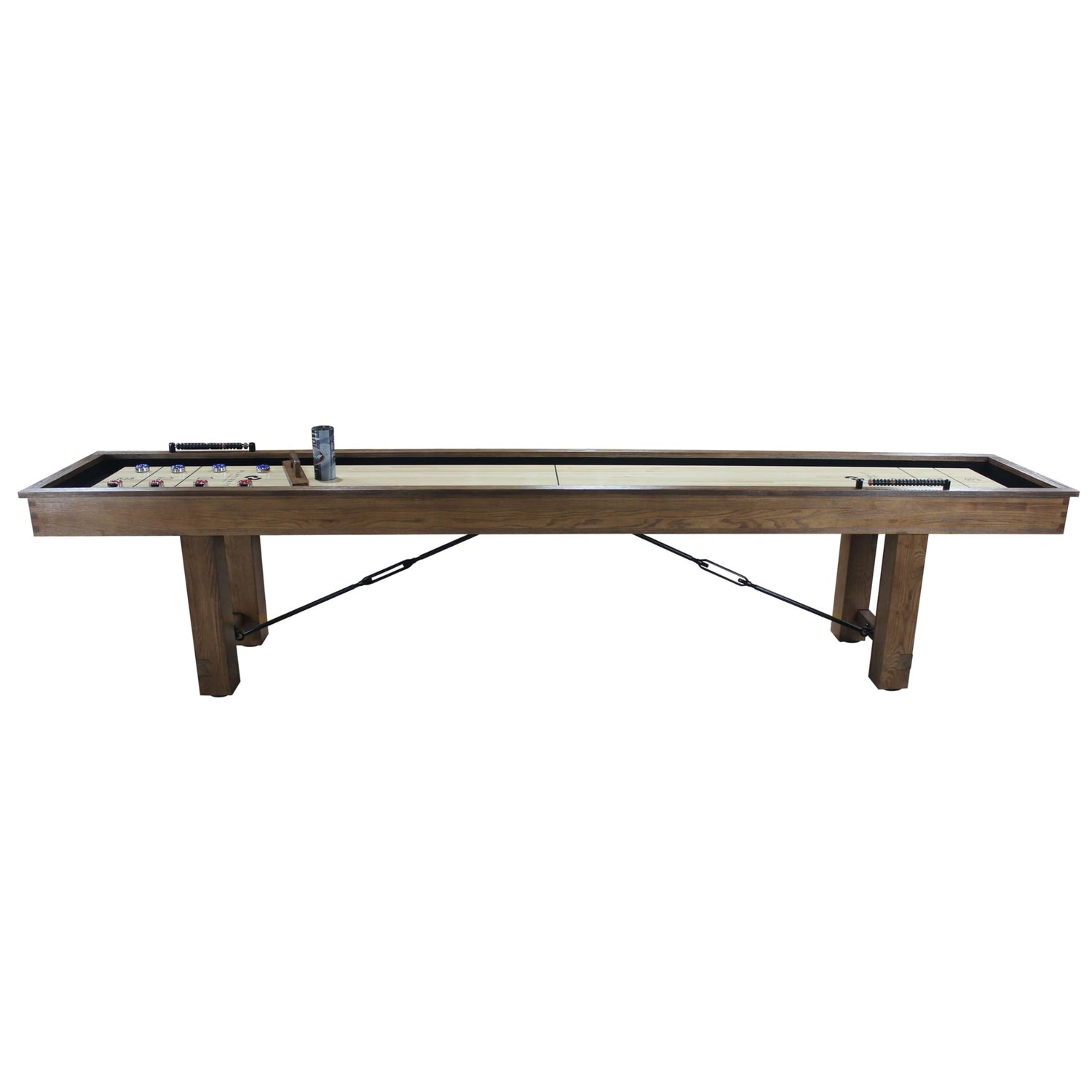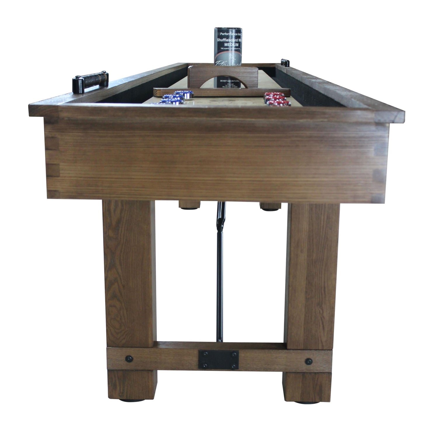 Details: The Montauk Pecan is Playcraft's newest home recreation series shuffleboard table. Solid hardwood construction with a pecan finish that features popular industrial design steel turnbuckle hardware, The Montauk is certain to be a highlight in your game room. The playfield is a 1-3/4" solid single vertical stave butcher block with multiple coats of satin polyurethane and includes upgraded pro-series style climate adjusters for shaping the playfield. The color matched hardwood abacus scorers finish off this beautiful table.