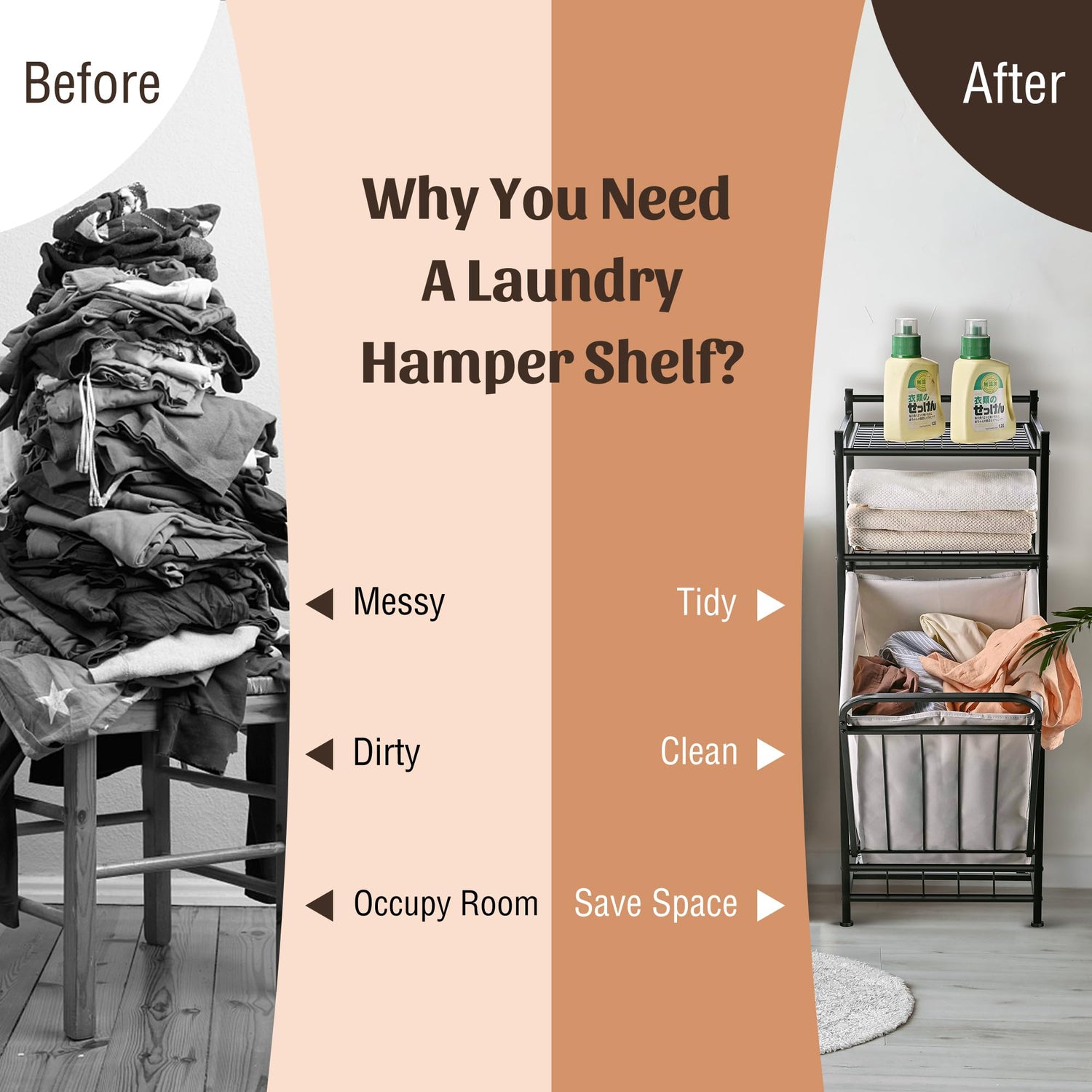 - 【Multifunctional Laundry cart】 : Featuring a 2-in-1 design, the 2 laundry hamper shelf at the top provide ample space to store laundry supplies, toiletries, fragrance or decor. The 65L laundry basket at the bottom provides a large capacity for your clothes and towels. Turn chaos into order.