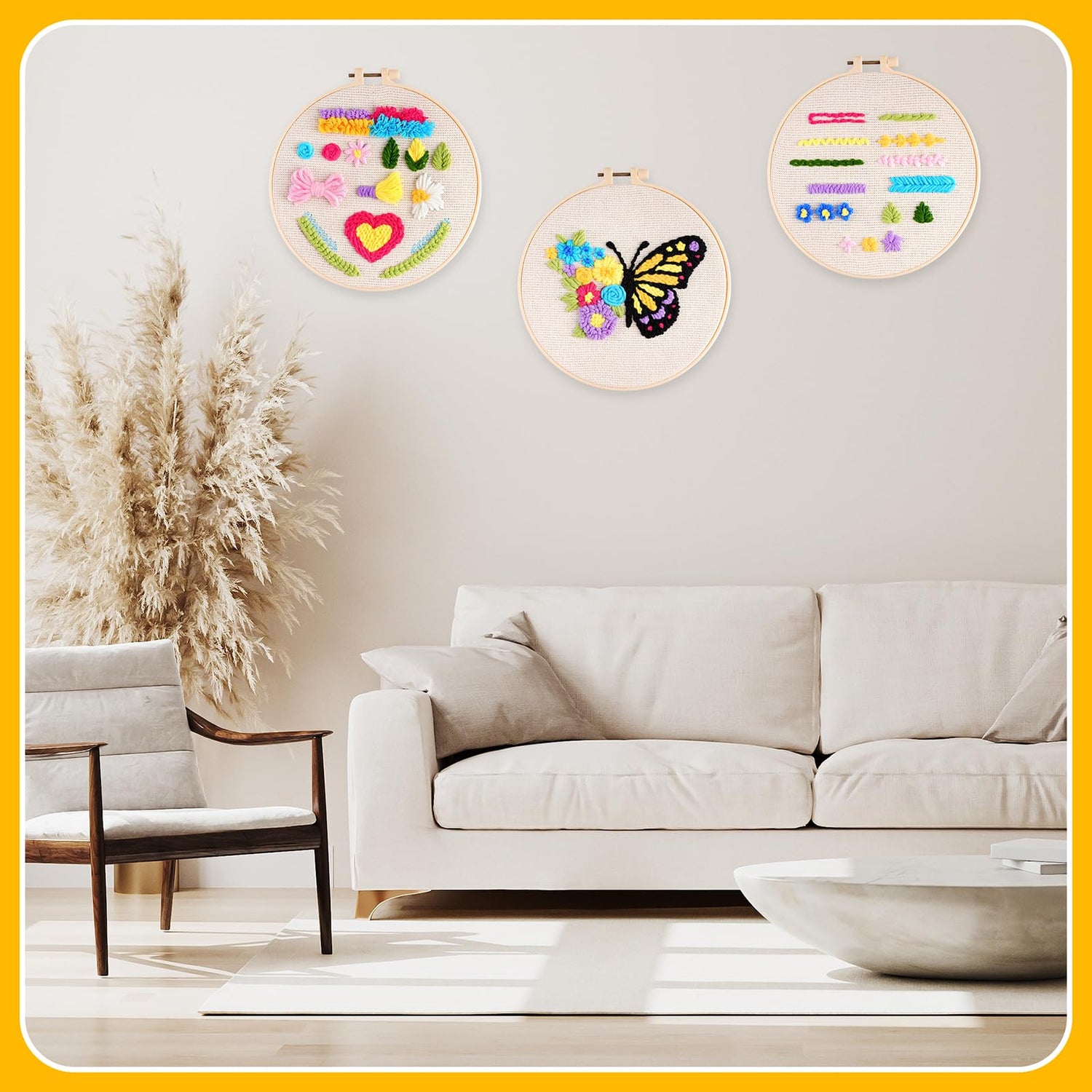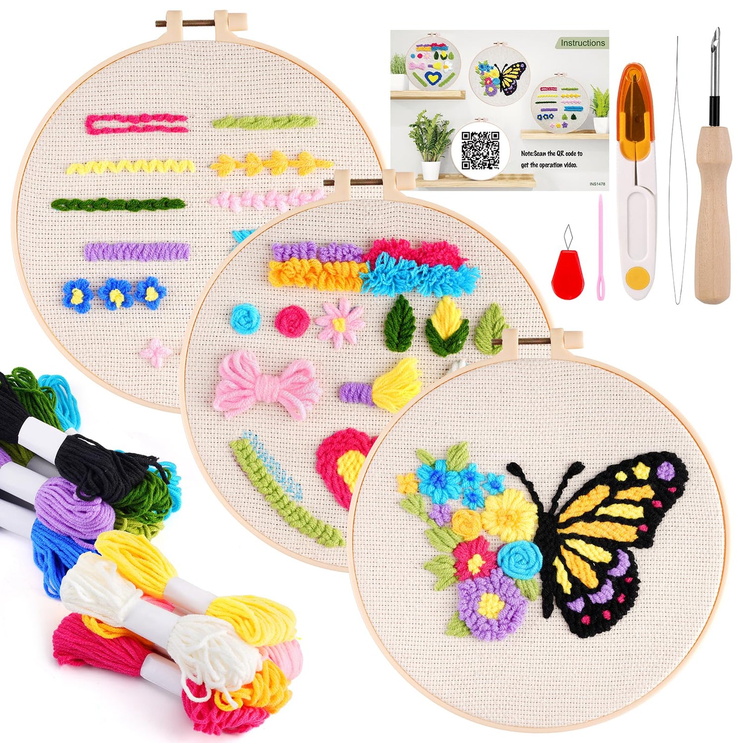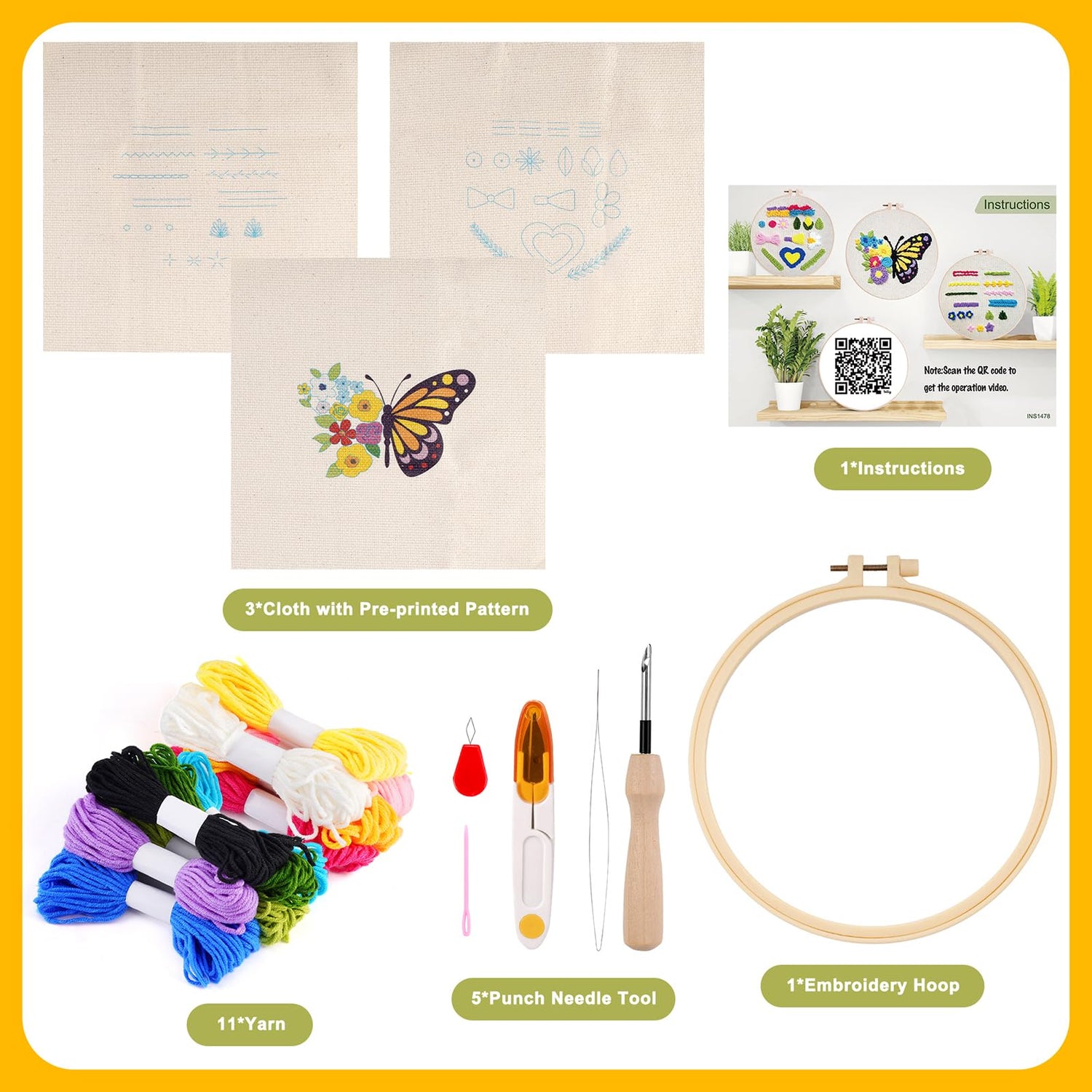 - Package Includes: 3Pcs cotton cloth with pattern, 1pc embroidery hoop(7.8inch), 11 Colors Yarn, 1 set of embroidery tools and 1 instructions