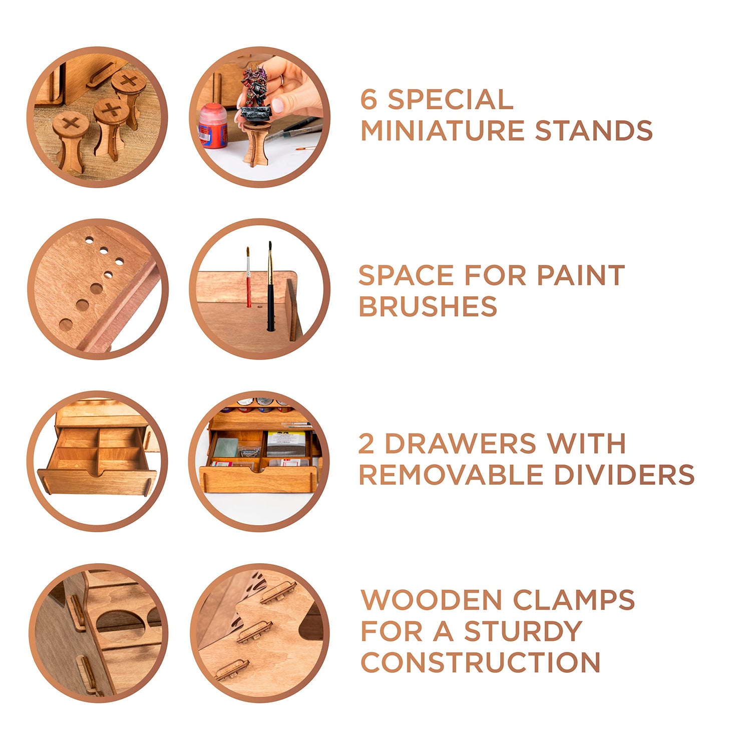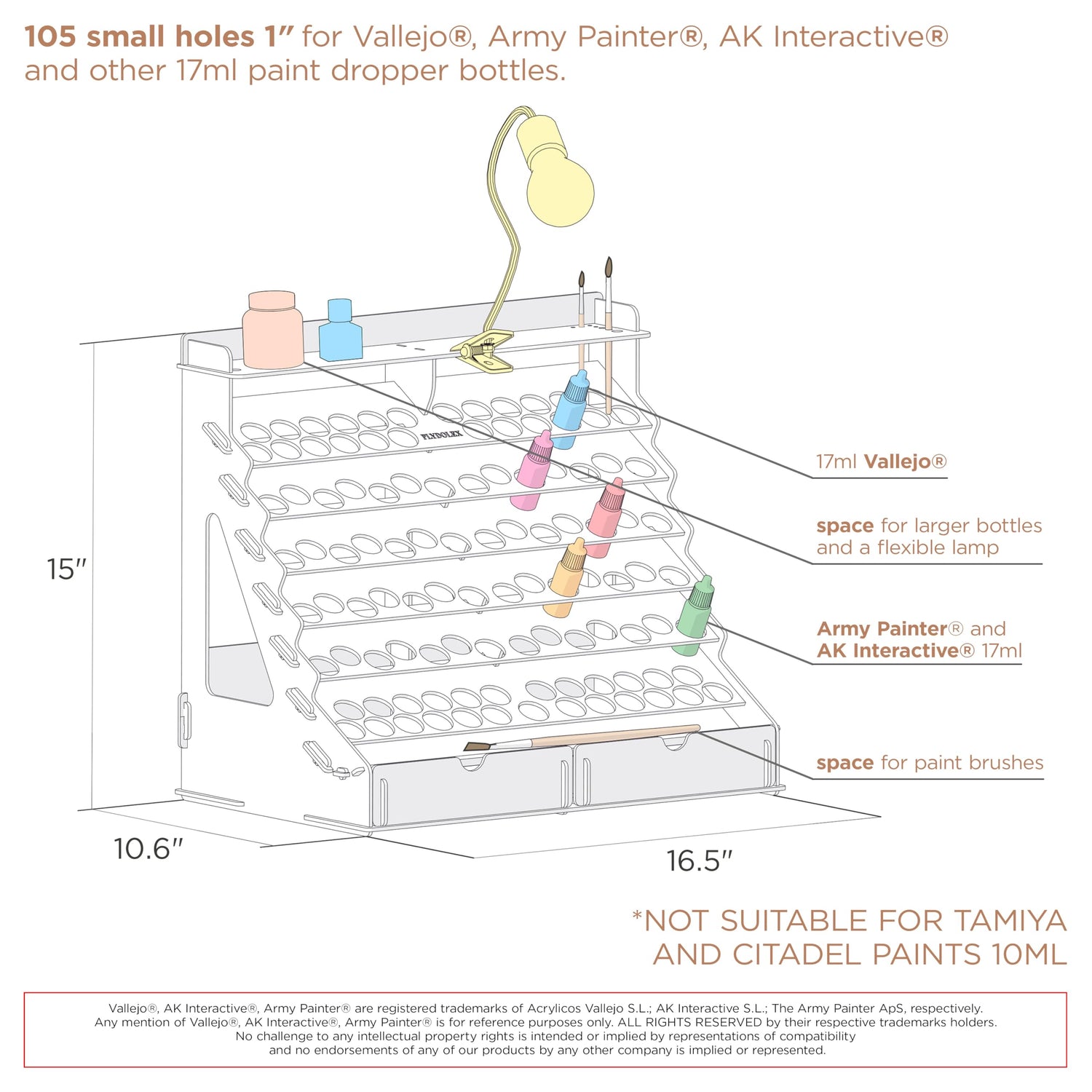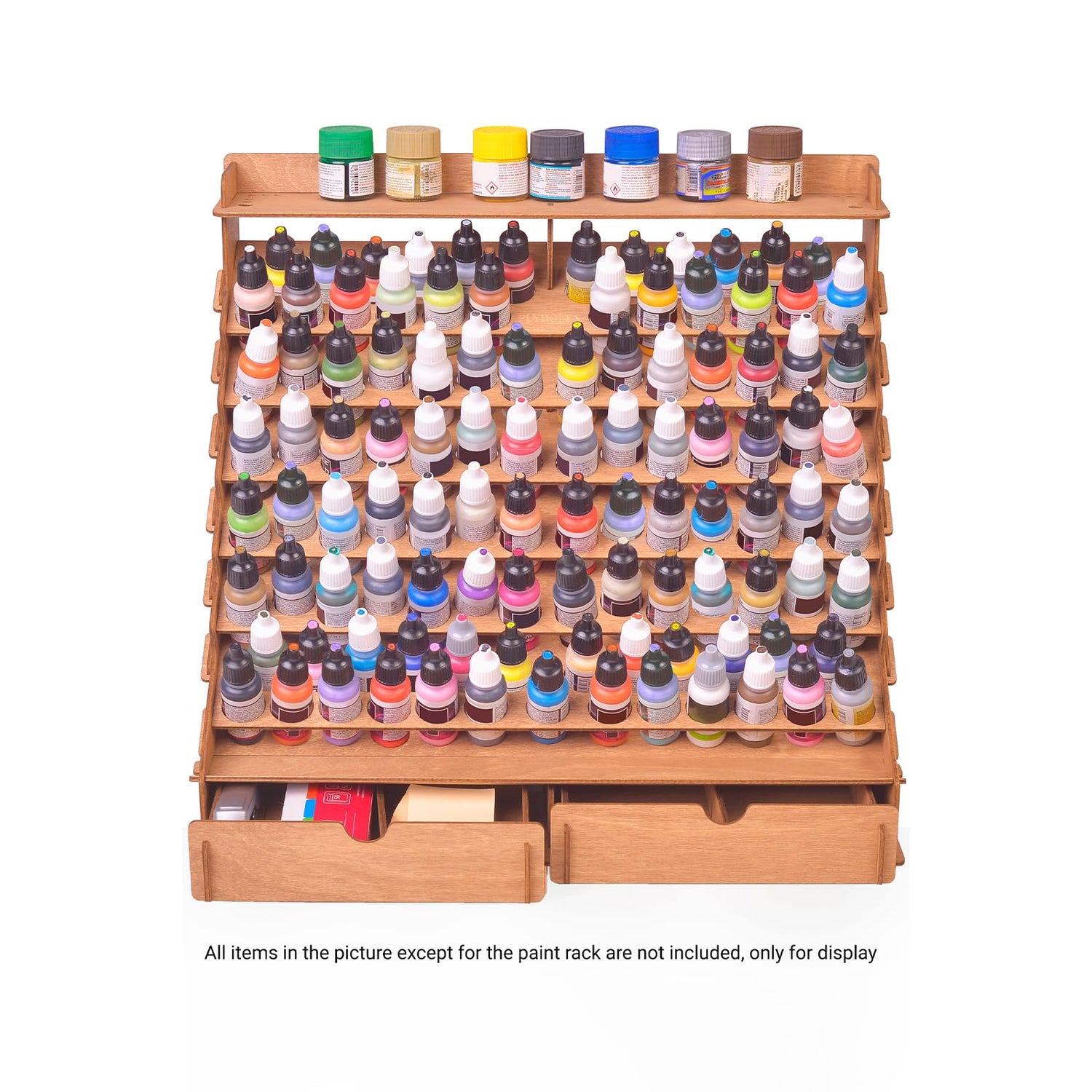 - Package info – The wooden paint storage rack contains 105 holes (1 inch diameter) and we think that this quantity is suitable for an artist of any level of professionalism. Also, Vallejo paint rack organizer has 14 holes for paintbrushes and two drawers, which are convenient to store other tools. For your comfortable art, we've added 6 stands for miniatures in our Vallejo paint rack set. Thereby you will be able to paint even the smallest details!