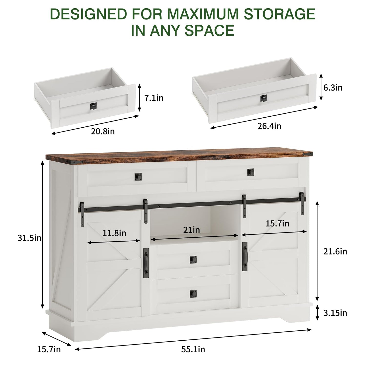 PLYFOU 55" Farmhouse Buffet Cabinet, Kitchen Sideboard with Sliding Barn Doors and 4 Drawers, Rustic Wood Storage Cabinet with Adjustable Shelves, 35'' Tall Coffee Bar Table for Dining Room, White