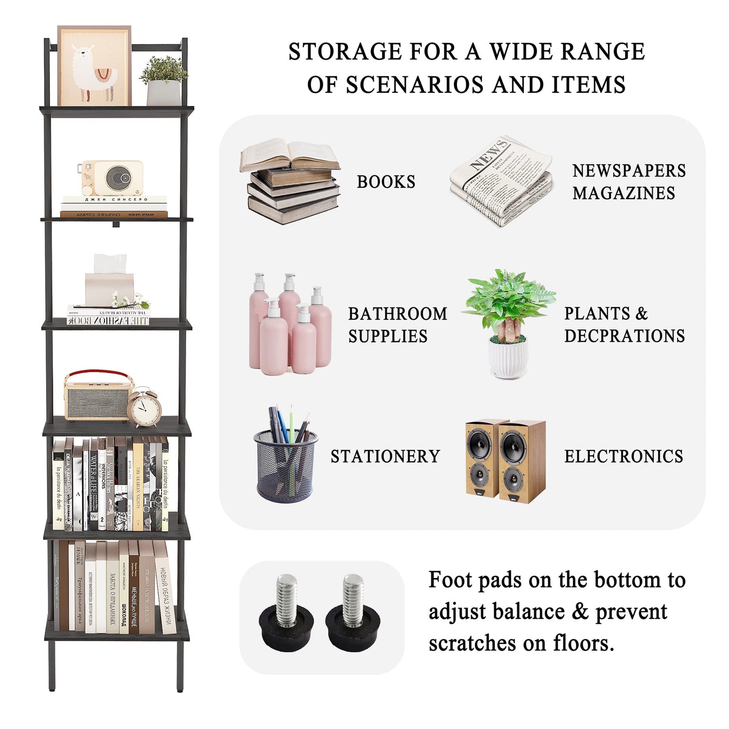 • Ample Storage Space: With six spacious tiers, this ladder bookshelf offers ample storage and display space for books, plants, decorative items, and more. Perfect for organizing and decluttering your home office, bedroom, or living room.