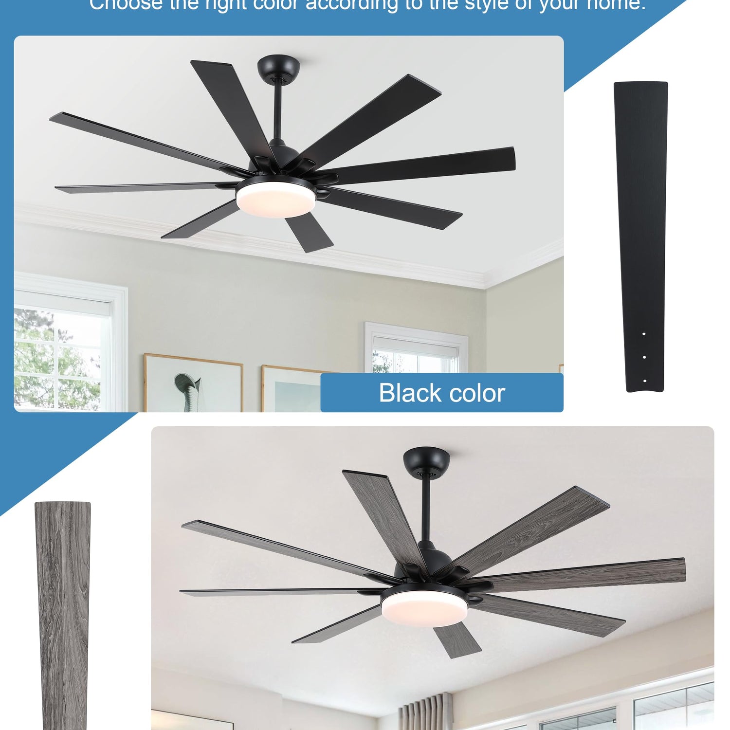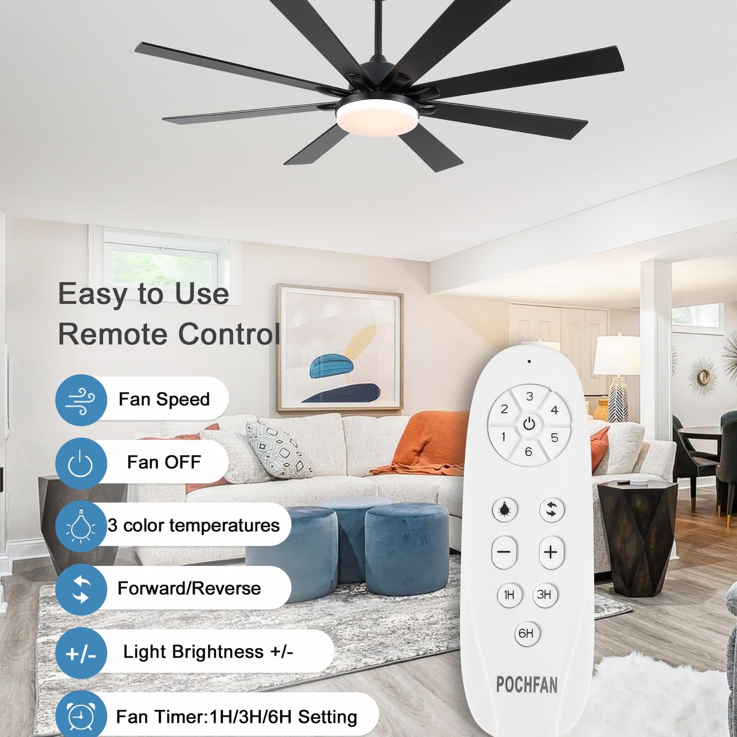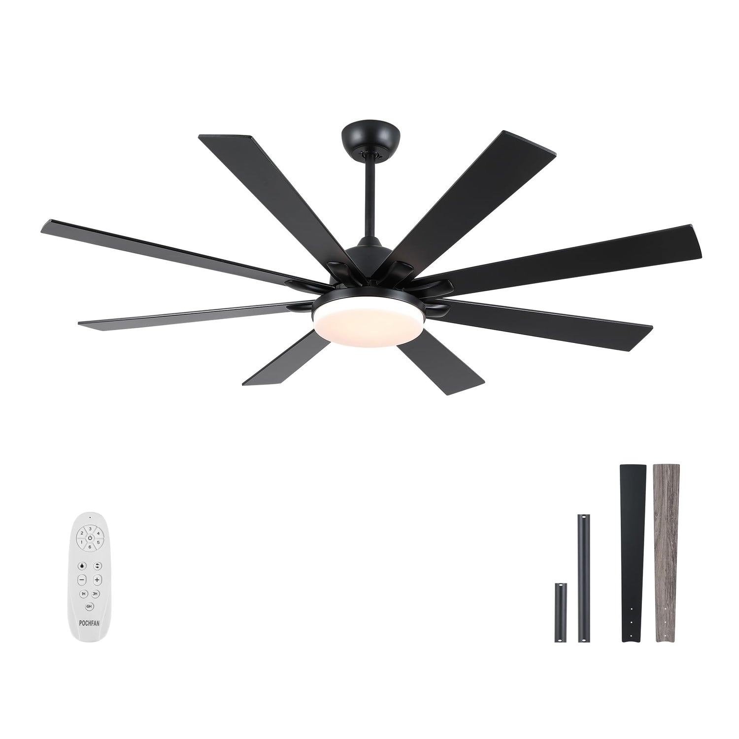 POCHFAN 62 inch Ceiling Fans with Lights and Remote Control, Large Black Ceiling fan with 8 Wooden Blades for Living Room Bedroom Patio, Quiet DC Motor, 3-CCT Dimmable,6 Speed